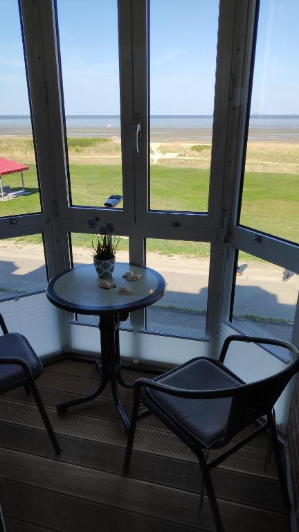 Die 180° Panoramameerblick - Ferienwohnung Sandkorn bietet Ihnen eine Unterkunft mit einem Balkon und einem Wasserkocher, etwa 9 km von der Aussichtsplattform Alte Liebe entfernt. Diese Unterkunft liegt direkt am Strand und bietet kostenfreie Fahrräder.