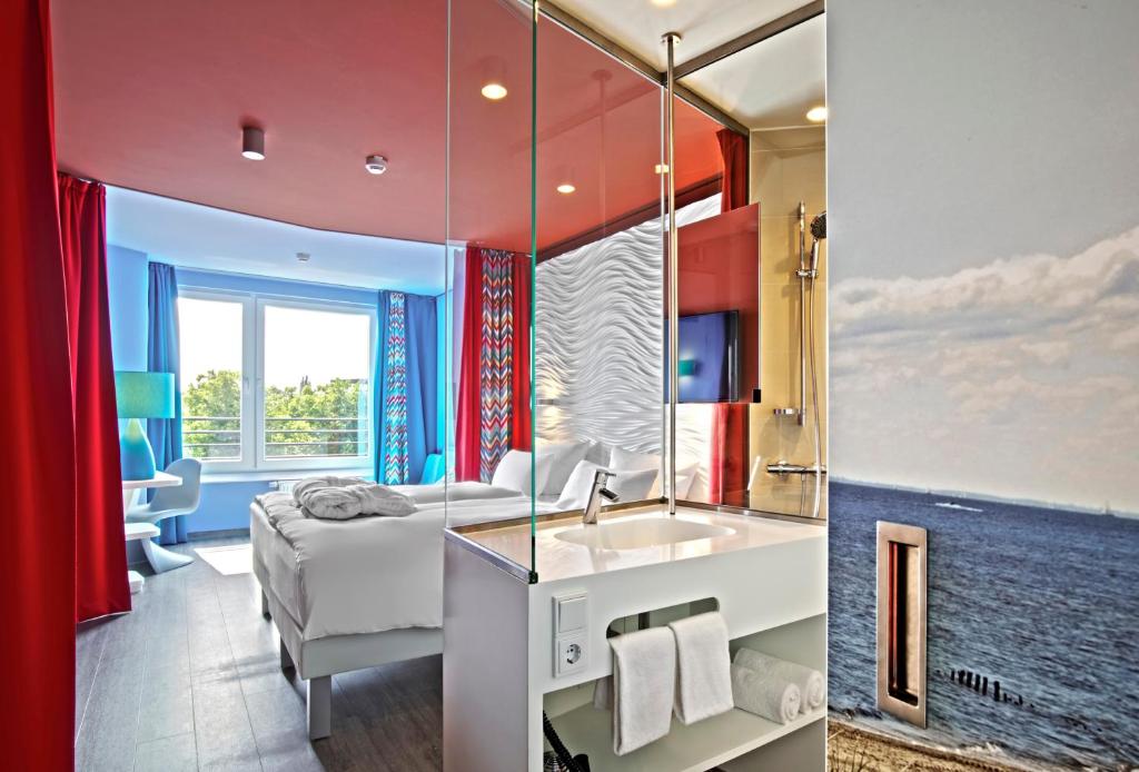 Dieses Resort liegt direkt am Strand im Herzen von Grömitz und ist der neueste Kurort an der Lübecker Bucht. Freuen Sie sich auf ein komplettes Urlaubserlebnis. Das aja Grömitz verfügt über ein Restaurant auf dem Dach. Freuen Sie sich außerdem auf ein Freizeitprogramm sowie Zugang zu den Wellnesseinrichtungen. Ihr Resort ist über einen Bademantelgang mit dem weitläufigen Meerwasser-Wellnesscenter Grömitzer Welle mit Aussicht auf die Ostsee verbunden. Dort erwarten Sie ein großzügiger Innenpool, Whirlpools und ein Familienbadebereich. Der Saunabereich umfasst eine finnische Sauna mit Blick auf die Ostsee, ein Dampfbad und einen beheizten Außenpool hoch über der Strandpromenade. Den Cardio- und Fitnessraum nutzen Sie kostenfrei. Gegen Aufpreis werden auch Massagen und andere Kur-/Wellnessanwendungen angeboten. Die geräumigen Zimmer im aja Grömitz sind modern eingerichtet und verfügen über 1 Kingsize-Bett. Jedes Zimmer bietet einen Sitzbereich, einen 48-Zoll-TV sowie ein eigenes Bad mit einer großzügigen Dusche. Rollstuhlgerechte Zimmer werden auf Anfrage angeboten. Das Marktbuffet, wo Gerichte direkt vor Ihnen zubereitet werden, bietet abwechslungsreiche Speisen, ein reichhaltiges Frühstücksbuffet und frisch für Sie zubereitete Eierspeisen. Verweilen Sie auch in der Bar bei einem Longdrink, erlesenen Weinen und Bier vom Fass. Zum Mittagessen genießen Sie hier auch klassische Barsnacks wie Currywurst, Bratfisch mit Pommes frites, Burger mit Pulled Beef und Rindfleisch-Tatar. In der Hotellobby finden Sie einen rund um die Uhr geöffneten Minimarkt und einen Kosmetik-Flagshipstore. Die Mitarbeiter stehen Ihnen gern mit hilfreichen Tipps zur Erkundung der Umgebung zur Verfügung.