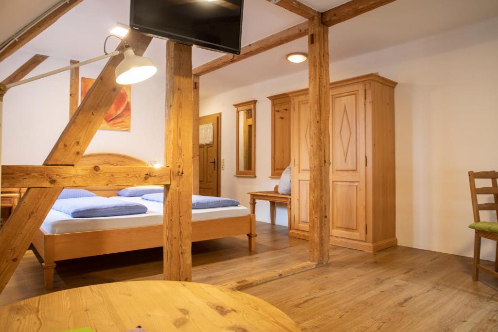 Die hellen Zimmer im Naturhotel Holzwurm befinden sich in einem Fachwerkhaus und sind im Landhausstil mit massiven Kiefernholzmöbeln eingerichtet.