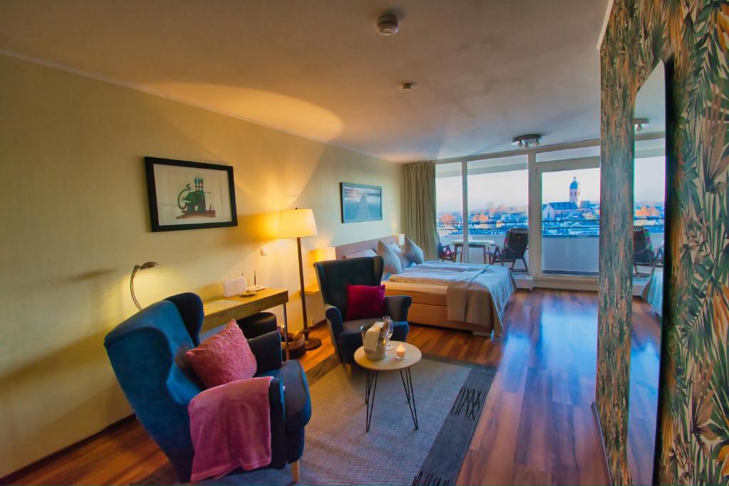 Darüber hinaus erwartet Sie das elegant eingerichtete Apartment mit einem Balkon und einem eigenen Bad. Genießen Sie die wunderschöne Aussicht über die Stadt.