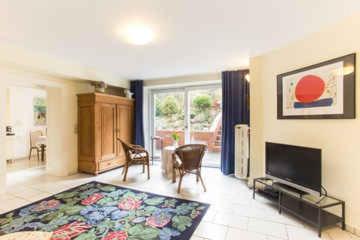 Appartement im Souterrain einer klassischen Villa aus dem Jahr 1910. Die Wohnung ist modern ausgestattet mit bodentiefen Fenstern und Terrassentür mit Zugang zur Terrasse und zum Garten.