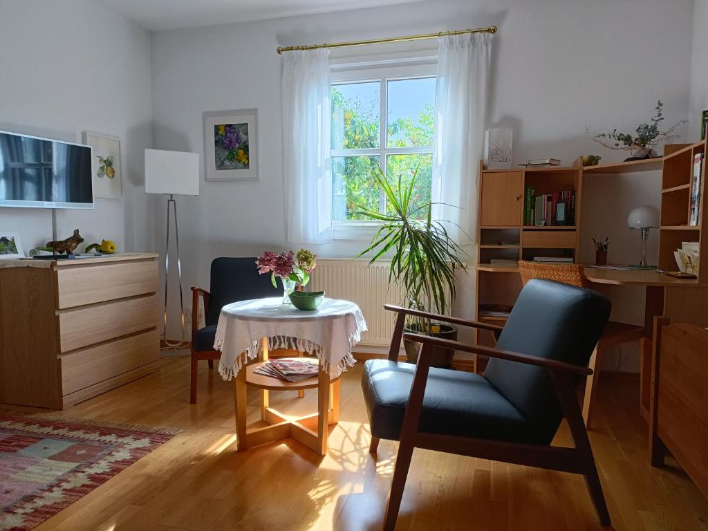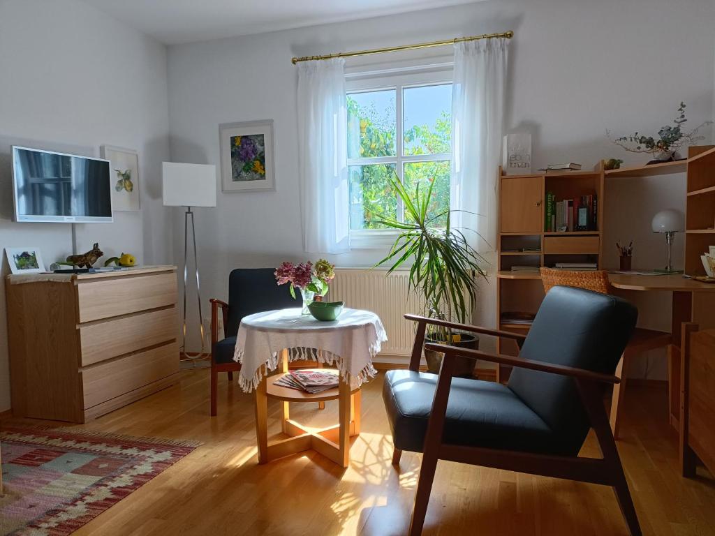 Charmantes Apartment für 1 - 2 Personen in einzelstehendem Einfamilienhaus im Südviertel von Weimar, idyllisch gelegen, umgeben von viel Grün, EG, separater Eingang, Wohn-/Schlafraum, Schreibtisch, Essplatz, Flur, Dusche/WC, Gartennutzung (Liegen/Bänke). 5 bis 6 Gehminuten sind es bis zu den Bushaltestellen des Nahverkehrs, ca. 10 Gehminuten bis ins Zentrum der Stadt, PKW-Stellplatz vor dem Haus (auf Wunsch auch auf dem Grundstück), am Feininger Radweg gelegen (Fahrräder zur kostenlosen Ausleihe) vorhanden. Nahversorger (Discounter) in der Nähe. Wir sind während des Aufenthaltes unserer Gäste gern bereit, Auskünfte zu kulturellen Veranstaltungen und Events zu geben. Informationsmaterial stellen wir bereit. Unser Haus ist ein Nichtraucherhaus, wir gestatten das Rauchen im überdachen Eingangsbereich und im Garten.