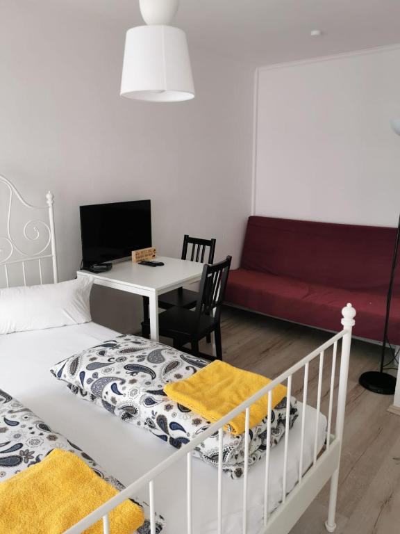 Das Apartment ist hell eingerichtet und verfügt über eine komplett ausgestattete Küchenzeile mit einem Esstisch. Auch ein Flachbild-TV, ein Kleiderschrank und ein eigenes Bad mit einer Dusche sind vorhanden.