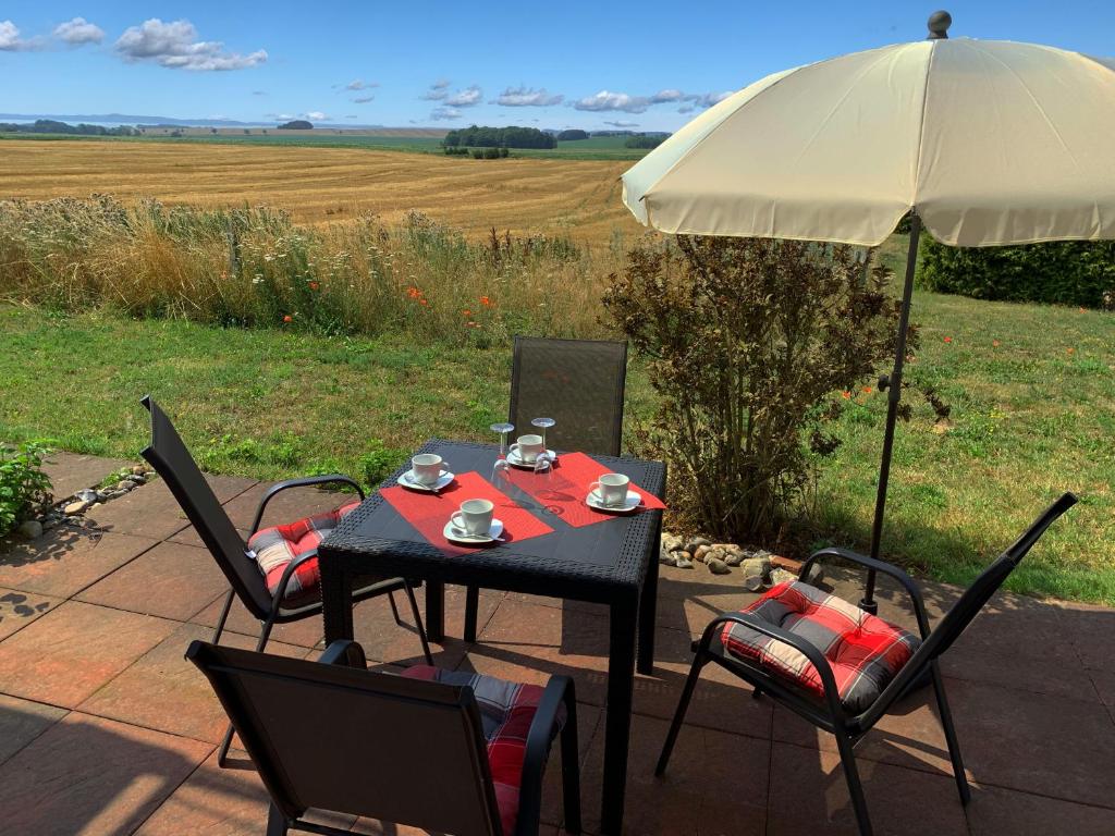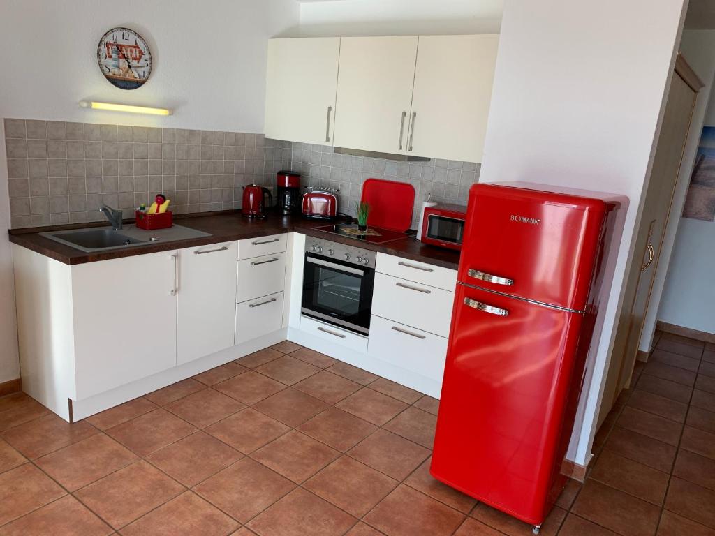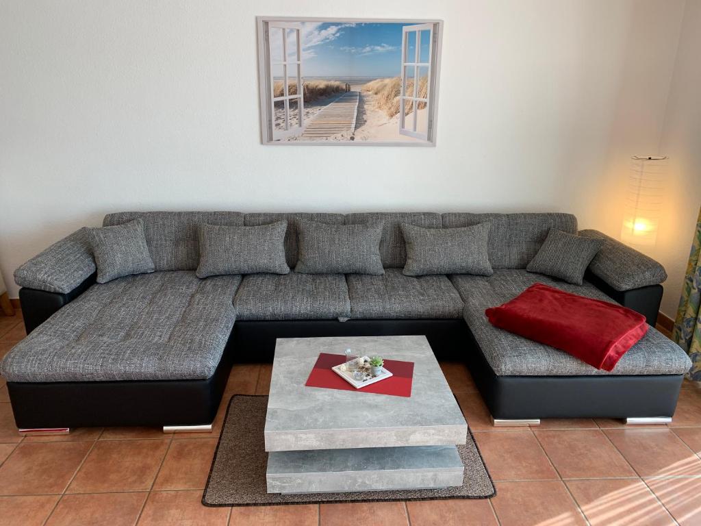 Im Wohnbereich befindet sich eine Sofalandschaft, die sich zu einem gemütlichen Schlafsofa umfunktionieren lässt (dadurch Aufbettung für bis zu 2 Personen) sowie ein Flachbild-TV (55 Zoll). Angrenzend an den hellen Wohnbereich haben Sie Zugang zu einer möblierten Terrasse (Sonnenschirm vorhanden), auf der Sie die Sonne in vollen Zügen genießen können. Gäste wussten in der Vergangenheit vor allem die Lage der Ferienwohnung im Außenring des Ferienparkes zu schätzen, wodurch ein unverbauter Blick auf die weiten Felder bis hin zum Jasmunder Bodden möglich ist. Der Ostseestrand von Glowe ist auch nur wenige Autominuten entfernt. Einen Parkplatz zu Ihrer Alleinnutzung finden Sie neben der Unterkunft.