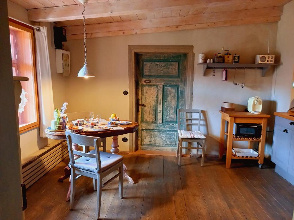 Das Apartment befindet sich in einer ruhigen Lage mit Blick auf den Innenhof in einem historischen Gebäude. Es ist mit einer Kombination aus modernen Möbeln und Einrichtungsgegenständen im Vintage-Stil gestaltet. Es verfügt über einen Sitzbereich und eine voll ausgestattete Küchenzeile mit Esstisch.
