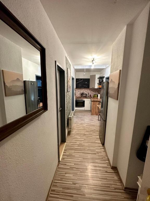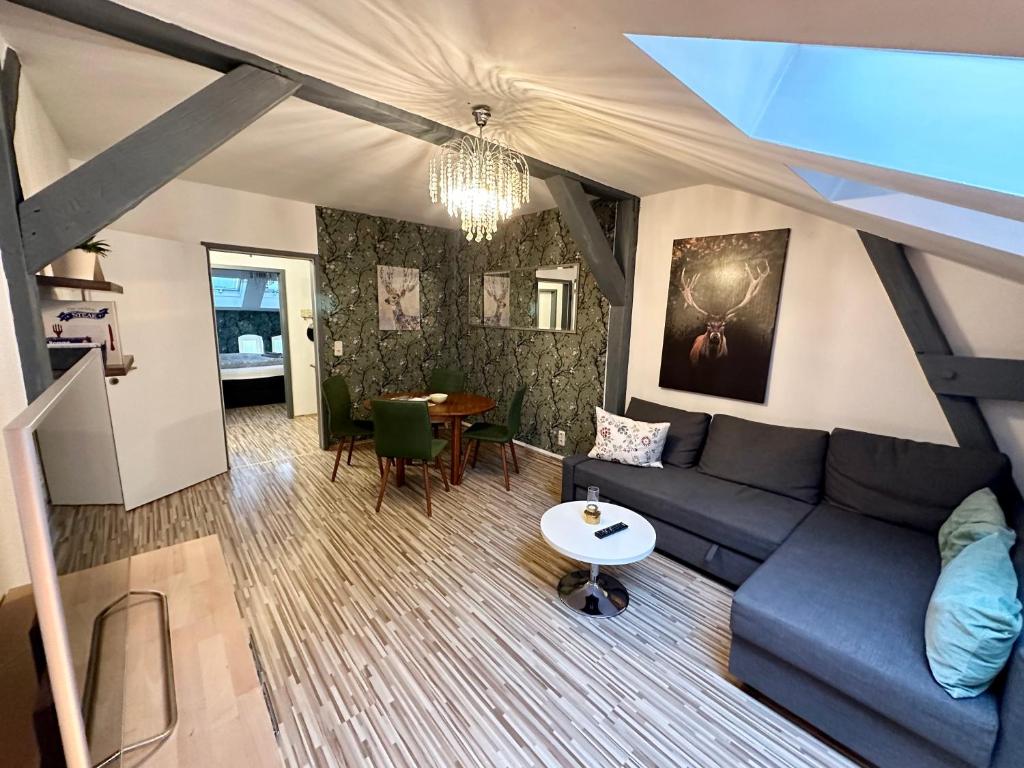 Eine Stilvoll eingerichtete 2-Raum-Wohnung inklusive WLAN und reservierten Parkplatz außerdem mit einer voll-ausgestatten Küche mit großem Kühlschrank, Geschirrspüler, Toaster, Wasserkocher und Microwelle. Gern stellen wir euch Tee, Zucker und Instant Kaffee zur Verfügung. Zum kochen sind Salz, Pfeffer und andere Gewürze für euch vorhanden. Die Wohnung befindet sich in der zweiten Etage, eines sanierten Altbaus und erhält durch ihre Dachschrägen und die kleinen Fenster erst ihren Charme. Durch das öffnen der Dachfenster im Wohn-und Schlafzimmer ist eine optimale Luftzirkulation gegeben und selbst bei hohen Außentemperaturen wird dadurch eine angenehme Innentemperatur erreicht. Im Winter sorgt die Zentralheizung für wohlige Wärme. Das Bad mit Tageslicht und Fenster bietet eine geräumige Dusche, Seife, einen Föhn sowie genügend Stauraum für alle Utensilien. Für jeden Gast stellen wir eine frisch bezogene Bettecke sowie ein normales und ein halbes Kissen zur Verfügung. Handtücher, Shampoo und Duschbad liegen ebenfalls für euch zur Benutzung bereit. Hunde sind bei uns herzlich willkommen, mit Rücksicht auf zukünftige Gäste (und eventuellen Allergien) würden wir es begr