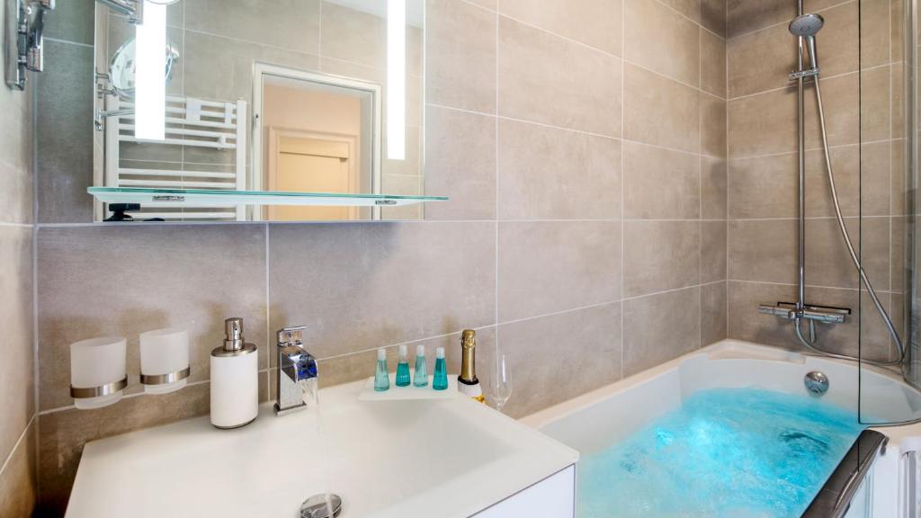 Das Apartment verfügt über einen Blu-ray-Player, eine Küche mit einem Geschirrspüler, einer Mikrowelle und einem Kühlschrank, ein Wohnzimmer mit einem Sitzbereich und einem Essbereich, 1 Schlafzimmer und 1 Bad mit einer Dusche und einer Badewanne. Ein Flachbild-Sat-TV, ein DVD-Player und ein CD-Player sind ebenfalls vorhanden.