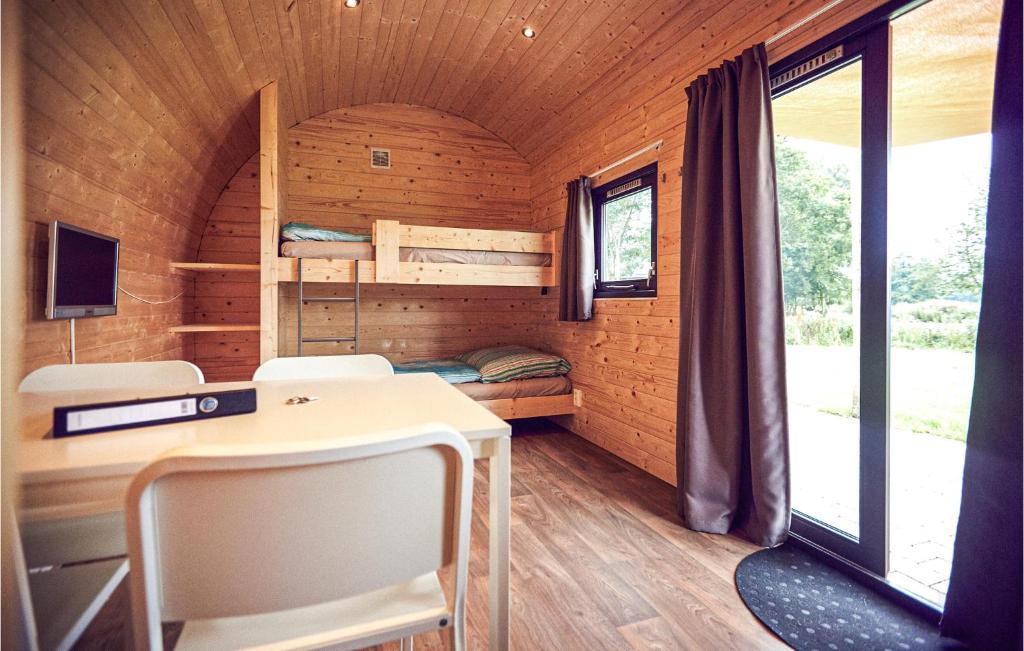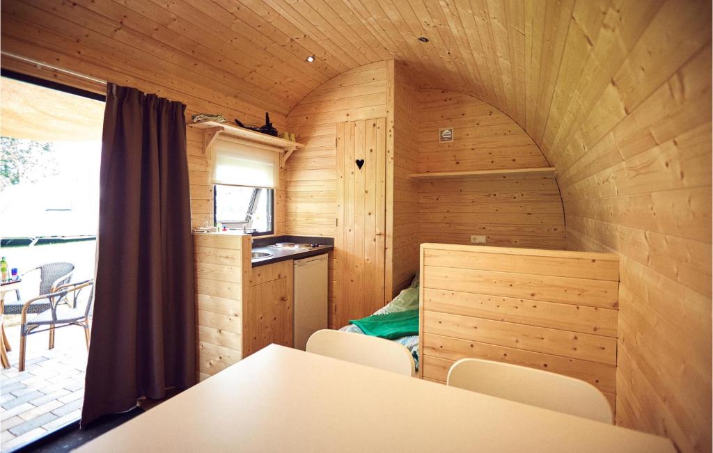 Dieses Ferienhaus verfügt über ein Wohnzimmer und eine voll ausgestattete Küchenzeile mit einem Kühlschrank. Ein TV ist ebenfalls vorhanden.