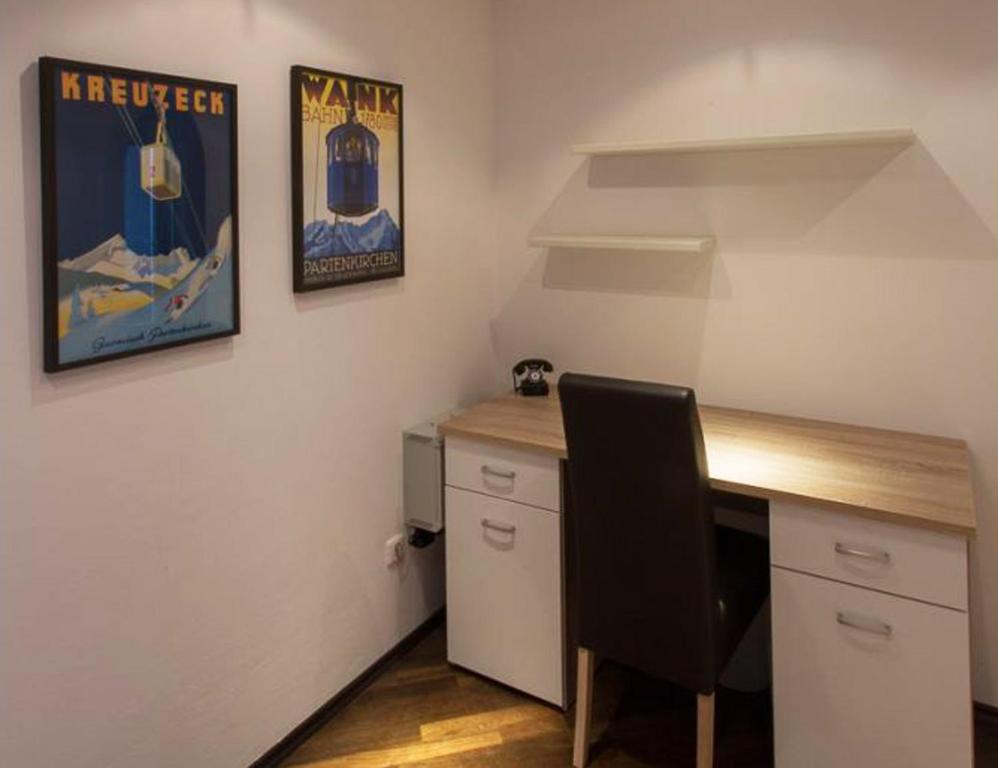 Die Ferienwohnung für 1 - 4 Personen (ca. 85 qm) ist im 1. OG eines gepflegten 6-Familienhauses. Großzügiges, modern ausgestattetes Wohnzimmer mit Schlafcouch, Flat-Screen TV, Blue-Ray Player und Stereoanlage. Eine gemütliche Essgelegenheit gibt es direkt neben der offenen Küche. Die Küche ist mit Spülmaschine, Herd und Backofen, Mikrowelle, Nespresso-Maschine und einem amerikanischen Kühlschrank - und vielem mehr -vollständig ausgestattet. Vom Wohnzimmer aus geht es auf den möblierten Südwestbalkon mit fantastischem Bergblick. Ein unverbaubarer Blick auf das Wettersteinmassiv mit Alpspitze und Zugspitze lädt zum Träumen ein. . Das große Schlafzimmer mit Doppelbett (2x2 m mit getrennten Matratzen) ist mit viel Stauraum für Ihre Urlaubsgarderobe ausgestattet, von dort haben Sie Zugang auf den Nordbalkon. Geräumiges Bad mit Waschbecken, Eckbadewanne, separate Dusche und WC sowie ein separates Gäste- WC. Im Eingangsbereich: Garderobe für Ski, Golfbags oder ähnlichem sowie im Flur ein kleiner Schreibtisch. Kostenfreies WLAN verfügbar. Ihr Auto können Sie (kostenlos) in der Tiefgarage parken.