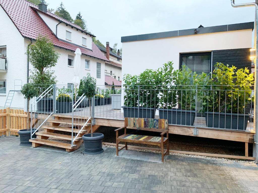 Herzlich willkommen im neu errichteten Ferienhaus am Eingang zur Altstadt von Pottenstein. Im modernen Bungalow mit ca. 55 m² Wohnfläche finden bis zu 4 Personen bequem Platz. Der offen und lichtdurchflutete Wohn- und Essbereich inklusive einer hervorragend ausgestatteten Einbauküche schafft eine wunderbare Atmosphäre, um erholsame Tage sehr komfortabel im Herzen der Fränkischen Schweiz zu verbringen. Genießen Sie die in U-Form umlaufende Terrasse mit Blick auf Pottensteins Natur mit der typischen Felslandschaft (große Sitzlounge vorhanden). Der Weihersbach schlängelt sich in unmittelbarer Nähe der Terrasse vorbei. Eine stimmungsvolle Grill-Lounge für bis zu 10 Personen steht Ihnen ebenfalls zur Verfügung. Auf der großen Grünfläche hinter dem Haus finden Sie im Sommer bequeme Daybeds. Der Bungalow verfügt über zwei Schlafzimmer und ein großes bequemes Schlafsofa im Wohnbereich. Alle Zimmer haben LED-TV und schnelle WLAN-Verbindung. Das Tageslichtbad verfügt über eine ebenerdige (barrierefreie) Dusche mit großen Spiegelschränken. Eine Waschmaschine wurde hier ebenfalls eingebaut. Ihr Auto parken Sie auf der Freifläche im Hof des Ferienhauses oder in der dazugehörigen Garage.
