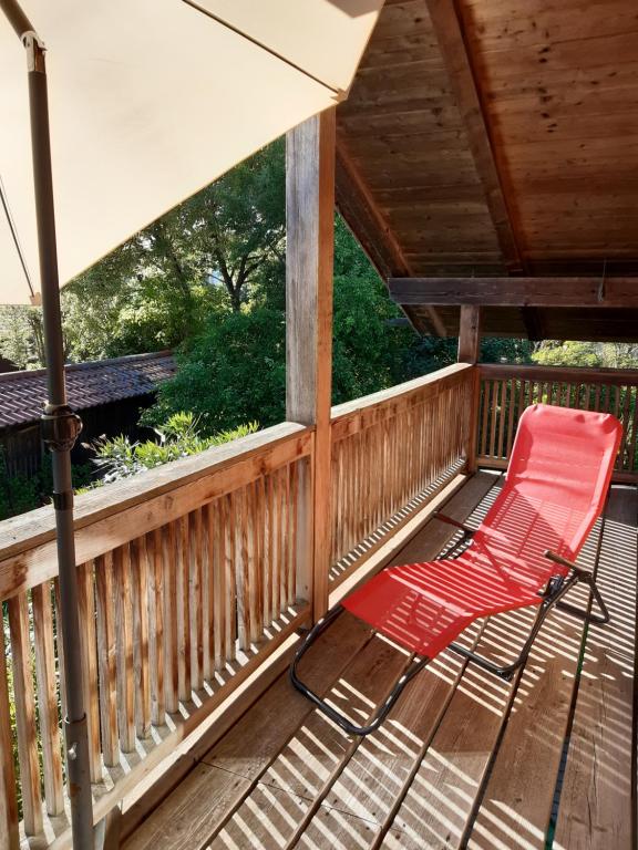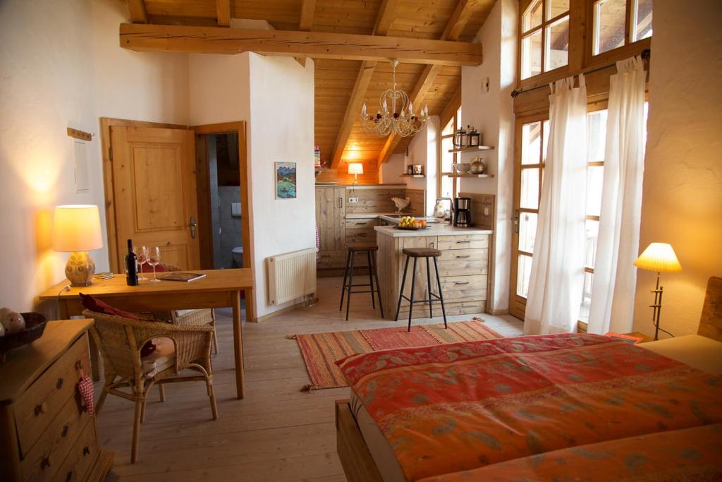 Für Gäste die gerne unabhängig sein möchten, bieten wir eine großzügige 3 Zimmer-Ferienwohnung im Atelierstil, ca. 105 qm, die Sie über einen separaten Eingang im I.Stock erreichen. 5 Personen können bequem übernachten. Wir bieten ein großes Doppelbett 2 x 2 m + ein Boxspringbett 1,80 x 2m + 1 Einzelbett. Die Wohnung verfügt über 2 Bäder, 1 kleines Bad mit Dusche + WC + Waschbecken und ein grosses Bad mit Dusche, Badewanne, Waschbecken u. WC. + kleiner überdachte Südost-Terrasse + ein Südwestbalkon über die gesamte Breite des Hauses, in angenehmer, ruhiger Lage in privatem, eigenständigem Wohnhaus, umgeben mit schön angelegtem Garten in reiner Wohnlage ohne Touristenrummel. Offener unbehandelter Holz-Dachstuhl, + Holzdielen-Fußboden aus unbehandeltem Holz, neue u. voll eingerichtete Küche incl. E-Herd mit Backwagen, Geschirrspülmaschine, Kühlschrank mit Gefrierfach. Handtuchwechsel alle 3 Tage, Bettwäschewechsel 1 x wöchentlich. Außerdem haben wir ein neues Babyreisebett mit biologischer Matratze zur Verfügung, indem ein Kleinkind bis zu 1 Jahr sicher bequem u. gut schlafen u. träumen kann. Leider können wir keine älteren Kinder aufnehmen, da zwei große Hunde zum Haus gehören.