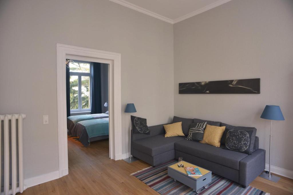 Genießen Sie Ihren Aufenthalt im lichtdurchfluteten, großzügig geschnittenen 2-Zimmer-City-Apartment Reger. Die 55qm bieten ein modernes Ambiente in einem über 100 Jahre alten Stadthaus, gelegen in einer ruhigen Nebenstraße im Zentrum Krefelds. Die Wohnung ist komfortabel eingerichtet und verfügt über eine komplett ausgestattete Küchenzeile. Im Schlafraum, mit schönem Gartenblick, stehen zwei Boxspringbetten, die wahlweise als Einzel- oder Doppelbett zu nutzen sind. Ein gemütliches Schlafsofa bietet zusätzlichen Schlafplatz für eine dritte Person. In ca. 300 Metern Entfernung befinden sich der Bahnhof, ein Lebensmittelgeschäft und die Fußgängerzone. Eine Bäckerei sowie einen Bioladen erreichen Sie mit nur wenigen Schritten, hier wird auch ein kleines Frühstück angeboten. Zu Fuß erreichbar ist eine interessante Auswahl von Restaurants, sowie das Stadttheater, das Kino und das Kaiser-Wilhelm-Museum. Das Helios-Klinikum ist nur 1,3 km entfernt. Aufgrund der Nähe zum Bahnhof und der guten Autobanhnanbindung erreichen Sie Düsseldorf in kürzester Zeit. Damit ist die Lage der Wohnung nicht nur ideal für Besucher der Stadt Krefeld, sondern auch für Geschäftsreisende und Messebesucher