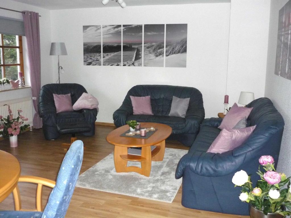 Gemütliche Ferienwohnung, ca. 75 qm, im Obergeschoss eines Mehrfamilienhauses, bestehend aus Wohnzimmer mit Sitz- und Essbereich, einem Schlafzimmer mit Doppelbett, einem Schlafzimmer mit Einzelbett und Schlafsofa mit TV, Küche mit Essbereich - ausgestattet mit Geschirrspüler und Mikrowelle, Bad mit Du/WC und Flur. Kinderbett vorhanden. Bettwäsche und Handtücher inkl. PKW-Stellplatz im Carport.