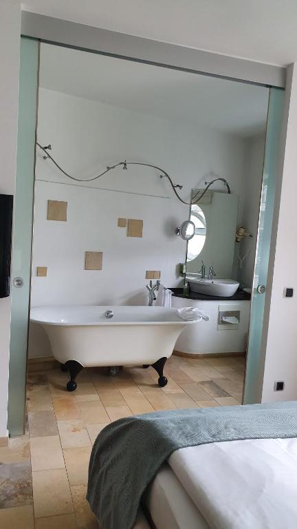 Alle Zimmer verfügen über Fußbodenheizung im Winter und auf der Etage.- im Sommer Kühlung, eine einstellbare Belüftung im Wohnzimmer, Safes und extra lange Betten erwarten Sie im familiengeführten Domaine Leidinger. Im Bad liegen Bademäntel und ein Haartrockner für Sie bereit. Einige Zimmer verfügen über eine freistehende Badewanne.