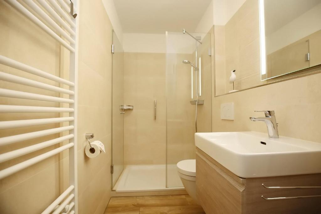 Die Ferienwohnung Nr. 7 in der Ferienanlage Dünenblick ist eine 3-Zimmer-Wohnung für bis zu 4 Personen. Die komfortable Ferienwohnung mit schönem Seeblick und Balkon in Süd-West-Lage liegt im 1.OG im Haus 1. Auf ca. 58 m² erwarten Sie ein Wohnzimmer mit Blick auf die Ostsee, zwei Schlafzimmer, eine Küchenzeile und ein Duschbad. Zum Strand sind es vom Dünenblick nur ca. 50 m. Das Wohnzimmer ist lichtdurchflutetet und mit einer bequemen Eck-Couch, Flachbild-TV (SAT-Anlage) und einer Stereoanlage mit CD-Player ausgestattet. Vom Wohnzimmer aus gelangen Sie auf den möblierten Balkon. Von hier können Sie den seitlichen Teilseeblick genießen. In der integrierten Küchenzeile finden Sie ein Cerankochfeld mit Backofen, einen Geschirrspüler, einen Kühlschrank mit Gefrierfach und eine Mikrowelle vor. Der großzügige Essplatz ist im Wohnbereich integriert. Das erste Schlafzimmer verfügt über ein Doppelbett (2 x 90 x 200 cm). Das Doppelbett im zweiten Schlafzimmer ist mit zwei Matratzen (80 x 200 cm) ausgestattet. Kleiderschränke in beiden Schlafzimmern bieten genügend Platz für Ihre Utensilien. Der Bodenbelag im Wohn- und Schlafbereich ist Laminat. Im Duschbad sowie im Flur wurden Fliesen verlegt. Für Urlaub mit Kindern finden Sie hier mit Kinderreisebett (inklusive), Kinderhochstuhl (inklusive), Wickelauflage, Kindertritt und einer Auswahl an Spielen eine kindgerechte Ausstattung vor. Das hell geflieste Duschbad bietet Waschtisch, Dusche und WC. In dieser Nichtraucherwohnung sind Haustiere nicht erlaubt. Ein Freistellplatz sorgt für die sichere Unterbringung Ihres Autos. Im Dünenblick stehen kostenloses WLAN, Abstellmöglichkeiten für Fahrräder, Waschmaschinen (Münzautomaten) und Trockner (Münzautomaten) zur Verfügung. Information zur Buchung: Im Mietpreis sind Nebenkosten wie Strom, Wasser und Heizungskosten enthalten. Bettwäsche und Handtücher sind nicht inklusive. Sie können bei uns gegen Gebühr ausgeliehen werden (ohne Beziehen). In der Hauptsaison vom 01.07. bis 31.08. sind lückenlose Buchungen zwingend erforderlich. Den aktuellen Belegungskalender können Sie jederzeit einsehen. Bei Buchungen über den Jahreswechsel beachten Sie bitte die Mindestmietdauer von 5 Übernachtungen.