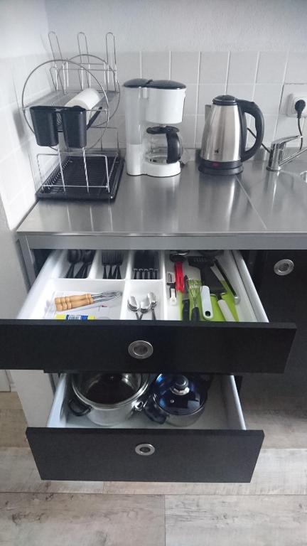 Die Küche ist mit einem Kühlschrank, einem Kochfeld, einem Toaster und einer Kaffeemaschine ausgestattet.