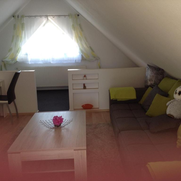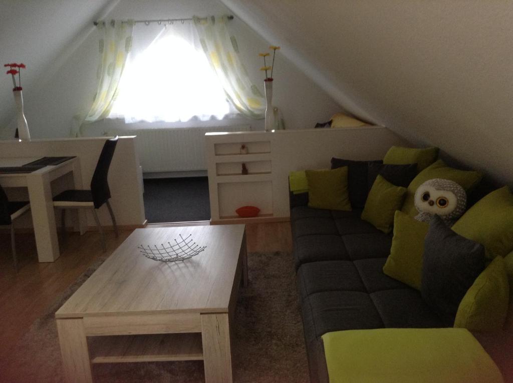 Gemütliche Ferienwohnung mit Dachschräge ca 35qm im 1.Stock unseres Getränkemarktes mit großer Terrasse für 1-4 Personen mit Blick in unserem liebevoll angelegten Garten. Das Eulennest wurde 2018 Eröffnet. Die Wohnküche ist mit allem ausgestattet was man braucht. Herd mit Backofen, Spülmaschine, Kühlschrank mit Minibar ( Kostenpflichtig),Kaffeemaschine, Wasseroberfläche, Toaster. Das Bad hat eine Dusche mit Spiegelschrank und Fenster zum Öffnen. Der Schlafbereich ist mit ein Doppelbett ausgestattet und eine Zusteĺlbett für 2 weitere Personen. Bei Bedarf können Sie auch ein Baby Bett dazu buchen. Hunde sind bei uns Willkommen. Wir haben auch eine kleine Cockerdame, die sich über Besuch freut. In der Wohnung darf nicht geraucht werden aber auf der Terrasse möglich. W-Lan steht Ihnen kostenlos zur Verfügung sowie ein Kostenloses Parken direkt vor der Unterkunft. Die Wohnung verfügt über einen Fernseher und Radio sowie ein Essbereich, für Gemütliche Abendstunden haben wir eine große Couch zum Entspannen.