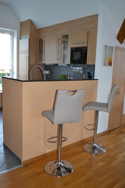 Wir bieten Ihnen auf der 1. Etage unseres Wohnhauses eine komplett eingerichtete 115 m² große Ferienwohnung. Die Wohnung wurde erst 2019 liebevoll und mit hochwertiger Küchenausstattung, einschließlich Induktionskochfeld und Spülmaschine für Sie eingerichtet, damit Sie einen möglichst angenehmen Aufenthalt verleben können. Außerdem stehen Ihnen zwei Stellplätze vor dem Haus zur Verfügung. Das 60 m² großzügige Wohn-Esszimmer mit offener Küche und einer Raumteilertheke besticht durch die komplett ausgebaute Giebelhöhe und vermittelt ein einzigartiges Raumgefühl. An der hellen Giebelseite des Wohnzimmers schließt sich ein 13 m² großer, sonniger Balkon zu Ihrer exklusiven Nutzung an. Drei getrennte Schlafzimmer bieten ausreichend Platz für 2-5 Personen.