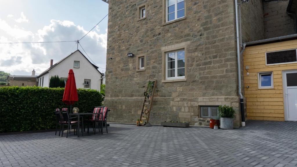 Herzlich willkommen im Ferienhaus „Alte Schule“. Hierbei handelt es sich tatsächlich um das alte Schulgebäude der Gemeinde. Unser neu restauriertes Ferienhaus wurde 1868 aus Tuff-Stein erbaut und liegt im Ortskern von Volkesfeld, in der schönen Ferienregion Laacher See zwischen grünen Wiesen und Feldern. Der Traumpfad „Heidehimmel“ liegt direkt vor der Haustür, Sie können sofort loswandern. Unser Ferienhaus ist nach DTV-Klassifizierung bewertet und mit 5 Sternen bis maximal 4 Personen ausgezeichnet Das Ferienhaus erstreckt sich über drei Etagen mit ca. 100m² Wohnfläche, einem separaten Waschraum und einem großen Hof mit Gartenmöbeln und Grill. In der ersten Etage befindet sich ein offenes Wohn- / Esszimmer mit einer modernen Einbauküche, einem Ess-Platz und einem gemütlichen Wohnbereich mit Flachbild TV. Hier ist auch das erste Schlafzimmer, ausgestattet mit einem Doppelbett einem zusätzlichen TV-Gerät und einem Wandtresor. Außerdem befindet sich auf dieser Etage ein WC. In der zweiten Etage sind zwei weitere Schlafzimmer jeweils mit einem Einzelbett und einer schönen Leseecke. Hier befindet sich auch das Badezimmer mit einer großen, flachen begehbaren Dusche.