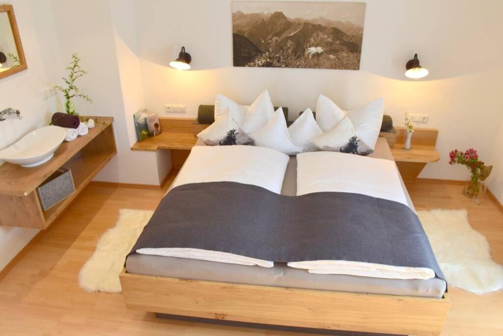 NEU "Ferienhaus am Dorfbrunnen & BERGBAHN INKLUSIVE" in Schöllang. 6km vor Oberstdorf & abseits vom Trubel. Vorteile der Hauptorte nutzen, aber beim Quartier besonders sein! Das sind wir! Bergbahn inklusive (wird kostenlos vor Ort dazugebucht) im eigenenen Ferienhaus auf über 120 m² zzgl. Balkon und Terrasse ist 2-geschoßig. Komplett ausgestattet. Ihr findet 4 SEPARATE Räume im Erdgeschoß. Im einzelnen: - geräumiges & gemühtliches Wohnzimmer mit Sat-TV 50" - heimeliges Esszimmer - große moderne Küche mit Geschirrspüler, Kühl- und Gefrierschrank, Kaffeevollautomat - geräumiges Badezimmer mit bodenebener Dusche, Fußbodenheizung, Badewanne und WC (Fön und Hand-/Duschtücher sind da). Ins Obergeschoß geht es über eine Innentreppe. Wir sind also leider nicht barrierefrei; Treppensteigen ist erforderlich. Im OG findet Ihr 2 großzügige Schlafzimmer mit Doppelbetten (Komforthöhe über 55 cm) & direktem Zugang zum Südbalkon & freiem Blick auf die Allgäuer Bergkette. Weiterhin gibt es ein separates Kinderzimmer/Zusatzzimmer für 2 Personen. Kinderreisebett, Bettgitter & Hochstuhl mit dabei. Weitere Fragen gerne unter 08326/384772 oder 0160/4610 544