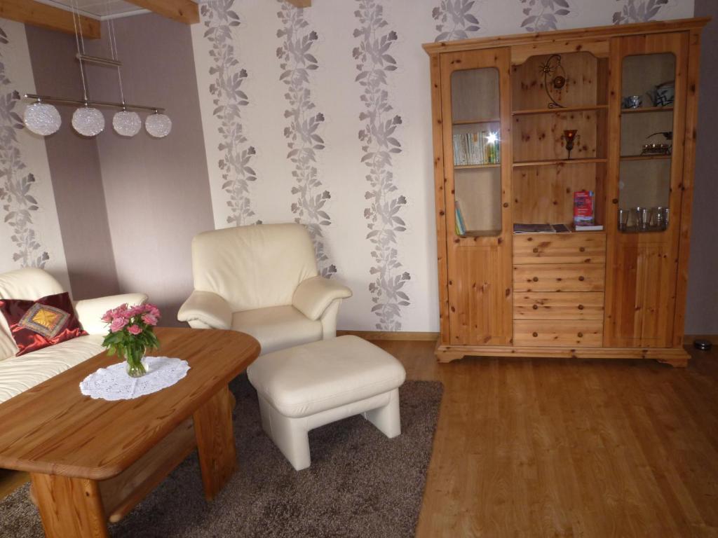 Das Ferienhaus bietet 52 qm Wohnfläche und ist für bis zu drei Personen geeignet. Im Erdgeschoss des Hauses befinden sich ein Duschbad voll ausgestattet mit Dusche, Waschbecken, WC, Fön sowie Hand- und Duschtüchern. Eine Küche mit allen Möglichkeiten zum Kochen und Backen, ein Kühlschrank mit Gefrierfach, eine Kaffeemaschine, Toaster, Eierkocher und Wasserkocher sind selbstverständlich vorhanden. Im Wohnbereich bieten Sofa und Sessel gemütlich Platz für drei Personen. Weiter ist er eingerichtet mit einem Schrank und einem Fernseher. Von hier führt eine Treppe ins Dachgeschoss zu den Schlafräumen. Ein Raum ist ausgestattet mit einem Doppelbett und eingebautem Kleiderschrank, in einem zweiten Raum befindet sich ein Einzelbett. Hier besteht die Möglichkeit ein Kinderbett aufzustellen. Kinderbett und Treppengitter gehören zur Einrichtung.
