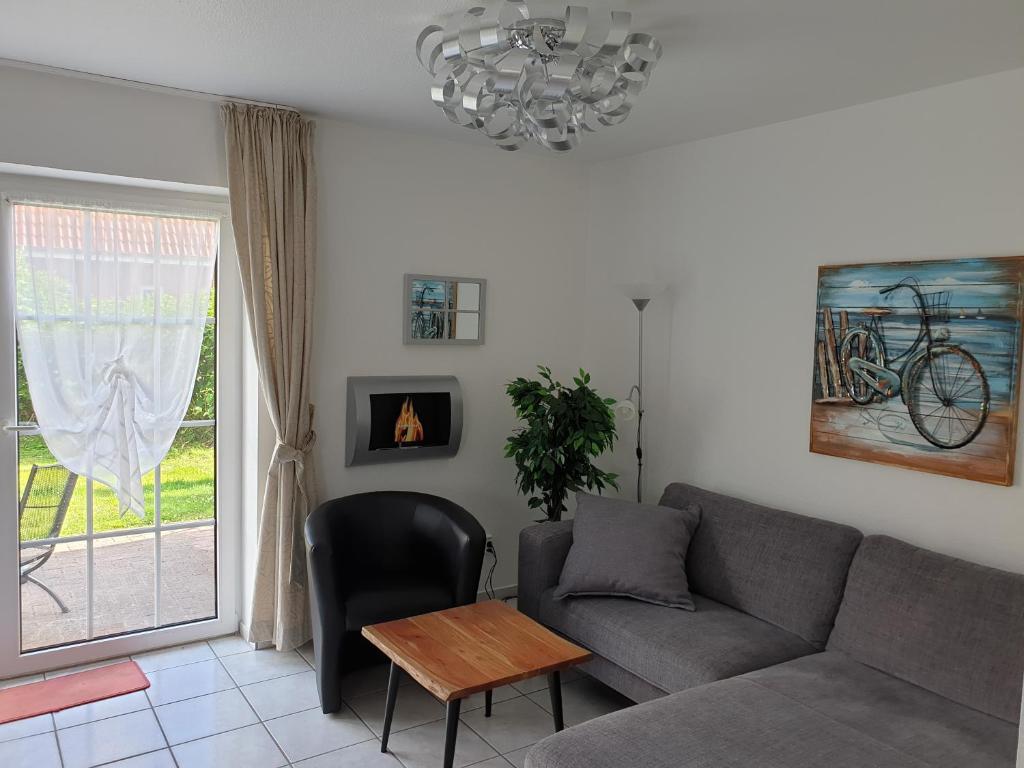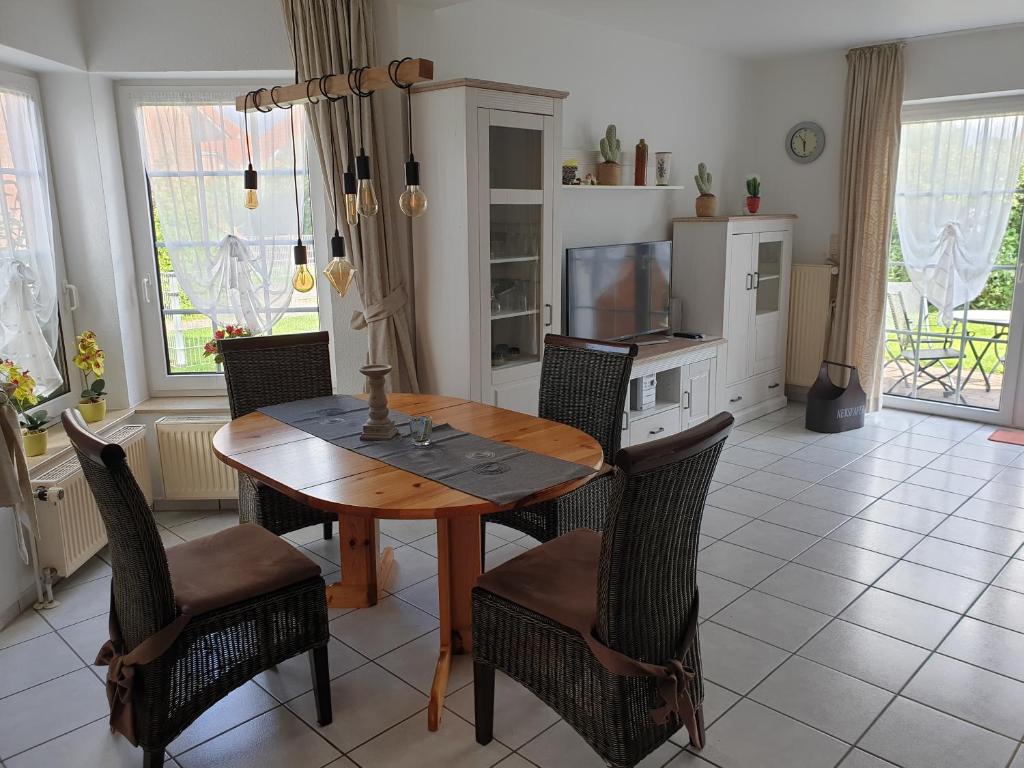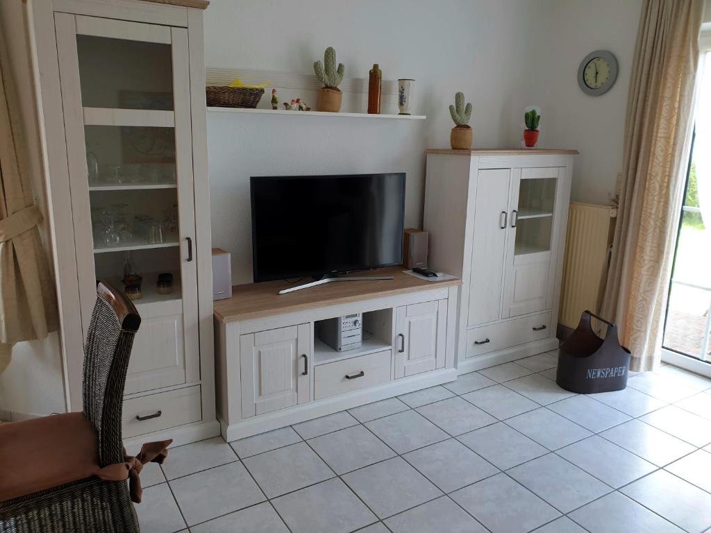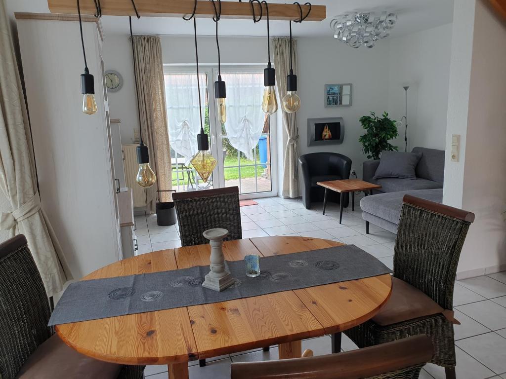 Doppelhaushälfte mit Südgarten am Ostfries. Nordseeküste für max. 4 Personen + Baby. 1,5 Etagen, Duschbad, separates Gäste-WC, 2 Schlafzimmer, Wohnzimmer, Küche, Waschmaschine. Das Ferienhaus Marion verfügt über 1,5 Etagen und einen nach Süden ausgerichteten Garten mit Terrasse. Internet (WLAN), Telefon (deutsche Festnetz-Flatrate). Im Erdgeschoss befindet sich eine Garderobe, Gäste-WC mit Fenster, Abstellraum mit Waschmaschine, Küche mit Geschirrspüler, Backofen, Mikrowelle, Kühlschrank mit Gefrierfach, Wohn-/Esszimmer mit 4 Stühlen am großzügigen Esstisch, Couch, TV, Möbel wie Schuhschrank, Wohnzimmerschrank . Im Obergeschoss befindet sich das Hauptschlafzimmer mit Doppelbett (Liegefläche 2 x 90 x 200 cm) einem Schlafzimmerschrank, Nachttischen. Nebenan befindet sich ein Kinderzimmer (2 getrennte Betten 2 x 90 x 200cm) und ein Schlafzimmerschrank. Auf der Etage befindet sich auch ein helles, freundliches Duschbad mit Dachfenster. Draußen gibt es 4 Gartenstühle, 2 Liegen, einen Gartentisch, Sonnenschirm, einen kleinen Gartengrill und einen Parkplatz.