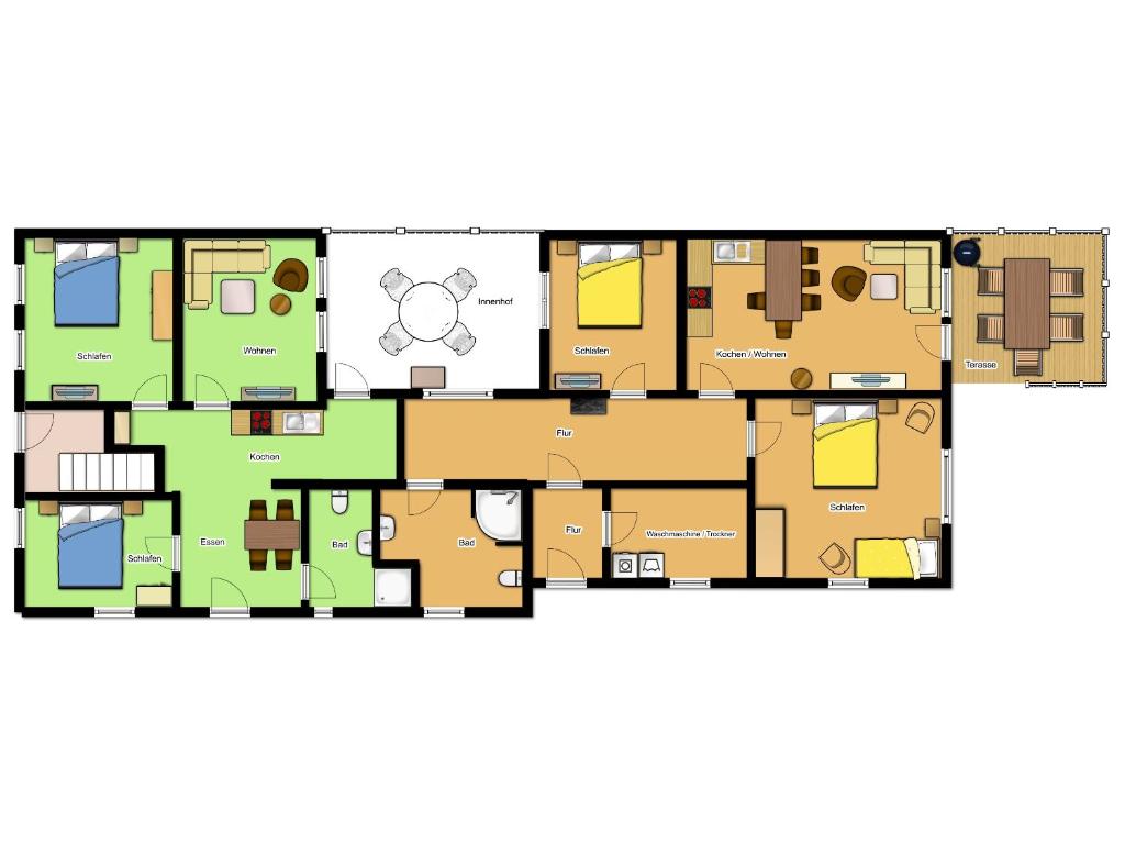 Das Ferienhaus beinhaltet insgesamt 3 Wohnungen für 1-5 Personen plus Kleinkind/Baby. Parkplätze stehen ausreichend zur Verfügung. Es gibt im Haus einen Gemeinschftsraum mit Waschmaschine und Wäschetrockner. Außerdem im Hinterhof eine kleine Gartenhütte für z.Bsp. Fahrräder oder Strandutensilien.