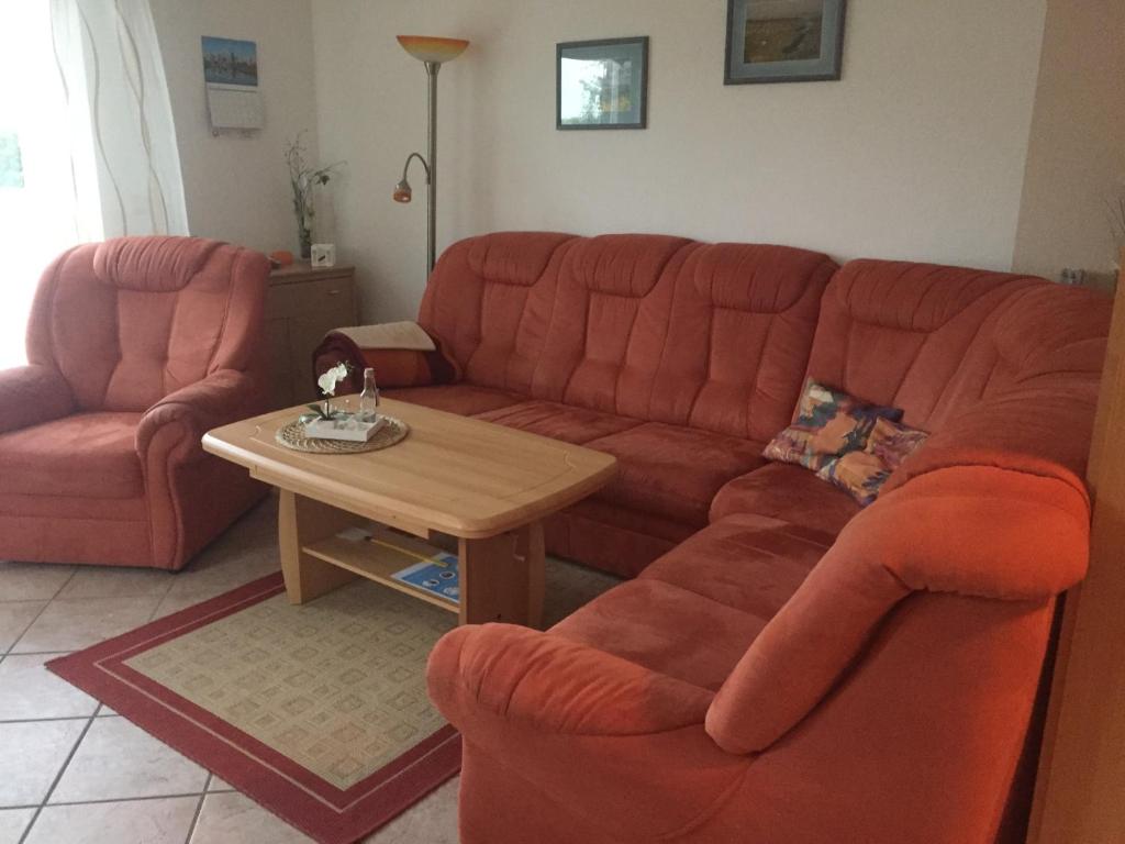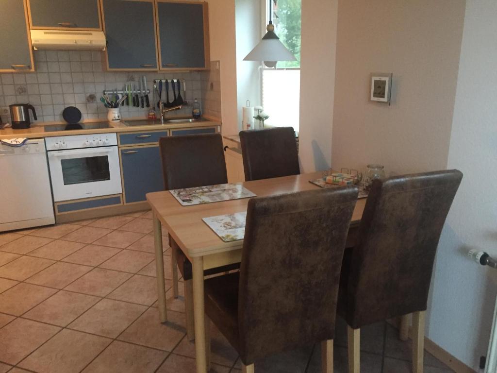 Die Wohnung ist gemütlich und komplett eingerichtet, hat eine Terrasse mit Möbel und Strandkorb sowie Sandkiste im Garten. Ein Carportplatz fürs Auto und ein Abstellraum stehen Ihnen zur Verfügung. Im Erdgeschoß befindet sich der Wohnraum mit Einbauküche (4 Plattenherd, Backofen, Geschirrspüler, Mikrowelle, Geschirr, Töpfe, Pfannen, Besteck und Gläser ausreichend für 4 Personen). An elektrischen Geräten sind vorhanden: Toaster, Kaffeemaschine, Eierkocher, Wasserkoch und Mixer. Ein Esstisch mit Stühlen, ein Ecksofa mit Sessel sowie SatTV, Internetanschluss und Radio. Ebenfalls im Erdgeschoß gibt es einen Abstellraum mit Waschmaschine, Bügelbrett und Bügeleisen. Im Dachgeschoß sind 2 Schlafzimmer. Ein Zimmer mit Doppelbetten, Kleiderschrank, 2 Nachtischen, Radio und Wecker, und ein Schlafzimmer mit 2 Einzelbetten. Das Bad besteht aus Dusche, WC, Waschbecken, Spiegelschrank, Handtuchwärmekörper und Föhn.