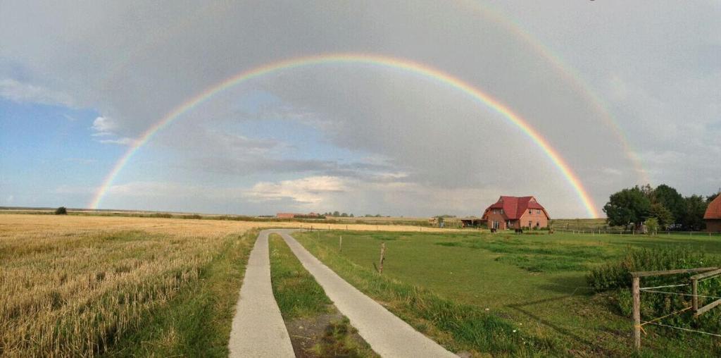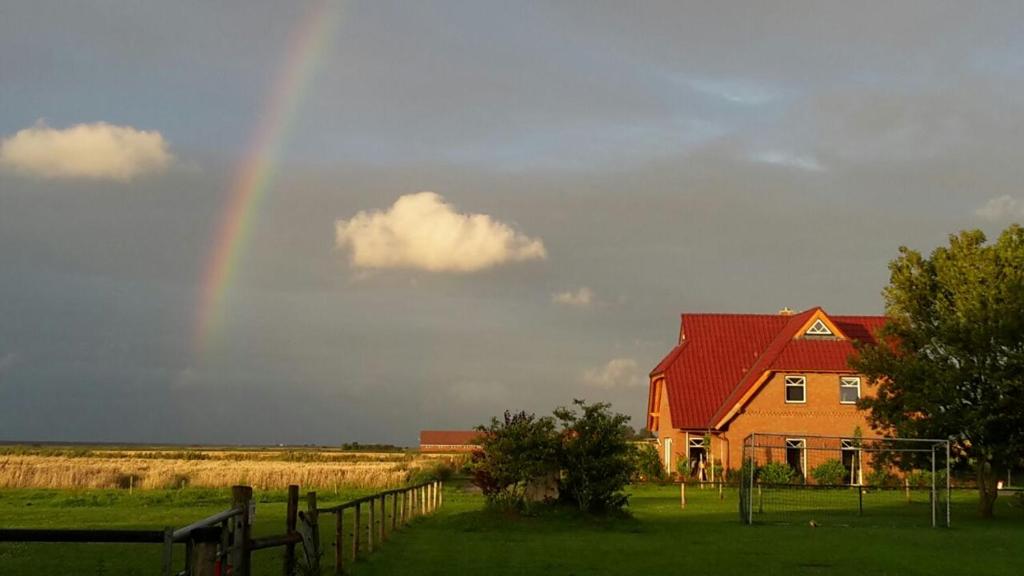 Whether ponies, goats, pigs chickens, cats, farm dog "Motte" ... with us there is much to discover every day. The children love to explore the farm, the many animals and the playground with the available Kettcars, while the parents enjoy the atmosphere and the "vastness". Our apartment "Bullerbü" is located directly as an extension in our beautiful Friesenhaus and is very bright and friendly. The ground floor is the large dining and living room with kitchenette, and a cozy couch. Directly adjacent is the modern, barrier-free bathroom. A spiral staircase leads to the upper floor with the two bedrooms. From there you can enjoy a great view of our goat pasture from the nursery. From the master bedroom one looks directly at the outdoor dike, over which one can even catch a glimpse of the light of the Wangerooger lighthouse in the dark. A beautiful view! From the family with small children to single elderly, who appreciate the tranquility of the region - the apartment Bullerbü meets many requirements, We hope that you spend a nice holiday on our farm!