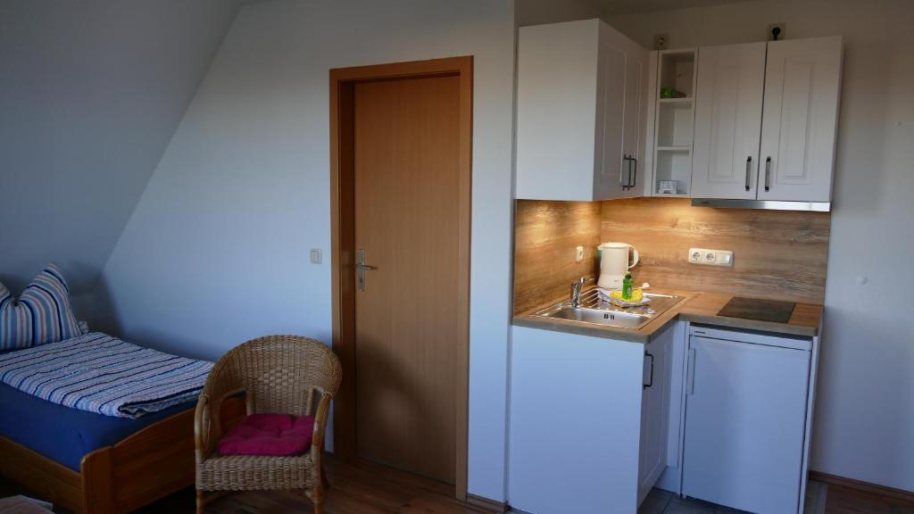 Ferienwohnung 2 ist die "kleine Ferienwohnung". Sie bietet Platz für 2 Personen. Hier stehen Ihnen auf ca. 25 m² ein kombinierter Wohn-Schlafraum mit 2 Betten, eine Miniküche und ein Bad zur Verfügung. Ausstattung: TV Radio mit CD-Spieler Miniküche WC & Dusche Handtücher Bettwäsche was sonst noch wichtig ist ... Die Ferienwohnung befindet sich in der 1. Etage. Die Ferienwohnung ist eine Nichtraucherferienwohnung. Wir nehmen keine Tiere auf. Die Mindestmietzeit beträgt 5 Nächte, in der Hauptsaison 7 Nächte.