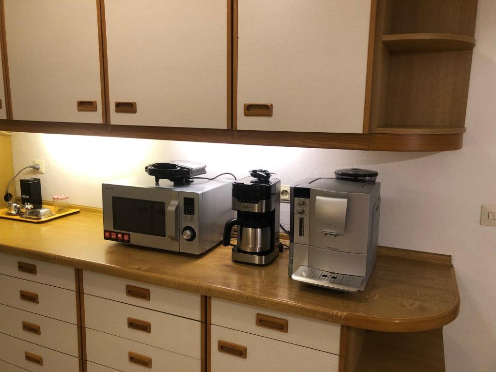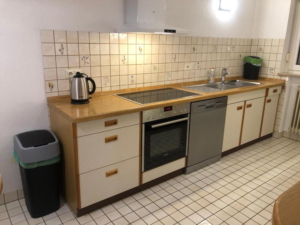 Unsere kleine Ferienwohnung mit zwei Zimmern liegt als Einliegerwohnung im OG eines Zweifamilienhauses. Sie ist über einen eigenen Eingang zugänglich und hat eine Wohnfläche von ca. 52m² und ist mit allem Notwendigen für unsere Gäste eingerichtet. Dazu gehört die Küche mit Geschirrspüler, Herd, Backofen, Kühl-Gefrierschrank, Mikrowelle, Kaffeevollautomat und vieles mehr. Im kleinen Wohnzimmer steht ein Sofa, das sich schnell in ein bequemes Bett (160cm x 200cm) für zwei Personen umklappen lässt. Im Schlafzimmer steht ein großes Ehebett (180cm x 200cm), ein Kleiderschrank mit Spiegeltür, Schreibtisch mit Stuhl sowie ein Smart-TV mit Satellitenempfang. Außerdem gibt es ein Bad mit Dusche sowie ein separates WC.
