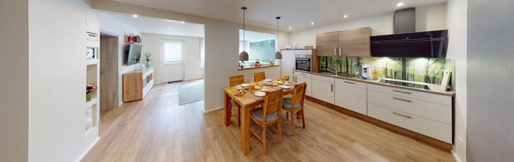 Im Erdgeschoss des Gebäudes befindet sich die Ferienwohnung Joena. Diese Wohnung wurde komplett neu ausgebaut und im März 2021 fertiggestellt. Sie verfügt über einen großen Wohn-Essbereich mit Schlafcouch sowie 2 Schlafzimmer und 2 separaten Bädern. Durch 2 Boxspringbetten bietet sie 4 Personen Platz und ist so perfekt für einen Familienurlaub. In Kombination mit einer ausziehbaren Schlafcouch liegt die maximal Belegung der Wohnung bei 6 Personen, um auch z.B. kleinen Wandergruppen ausreichend Platz zu bieten.