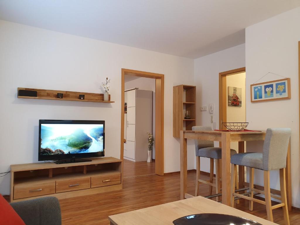 Dieses Apartment verfügt über 1 Schlafzimmer, eine Küche mit einem Kühlschrank, einen Flachbild-TV, einen Sitzbereich und 1 Bad mit einer Badewanne oder einer Dusche.