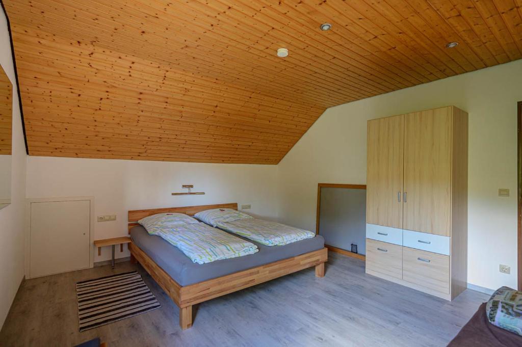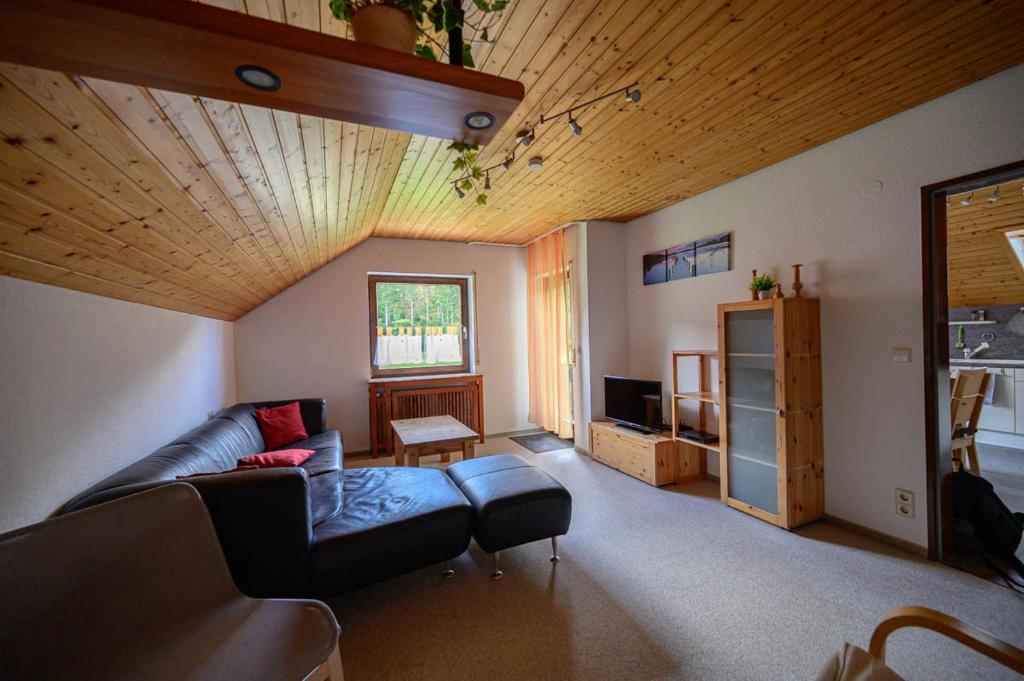 Unsere Ferienwohnung ist in ruhiger Lage umgeben von Wiesen und Wald. Sie bietet Platz für 1-6 Personen und hat je nach Personenanzahl 1 oder 2 Schlafzimmer (ca. 55-75m²). Im 1. Schlafzimmer ist ein Doppelbett und ein Kinderbett, im 2. Schlafzimmer ist ein Doppelbett und ein Schlafsofa. Die Essküche ist komplett eingerichtet mit Spülmaschine, Backofen, Kühlschrank, Senseo-Pad-Kaffeemaschine, Wasserkocher, Toaster und Radio. Das Badezimmer verfügt über eine Dusche und WC. Das geräumige Wohnzimmer ist mit TV und DVD-Spieler ausgestattet. Die Wohnung hat einen überdachten Balkon.
