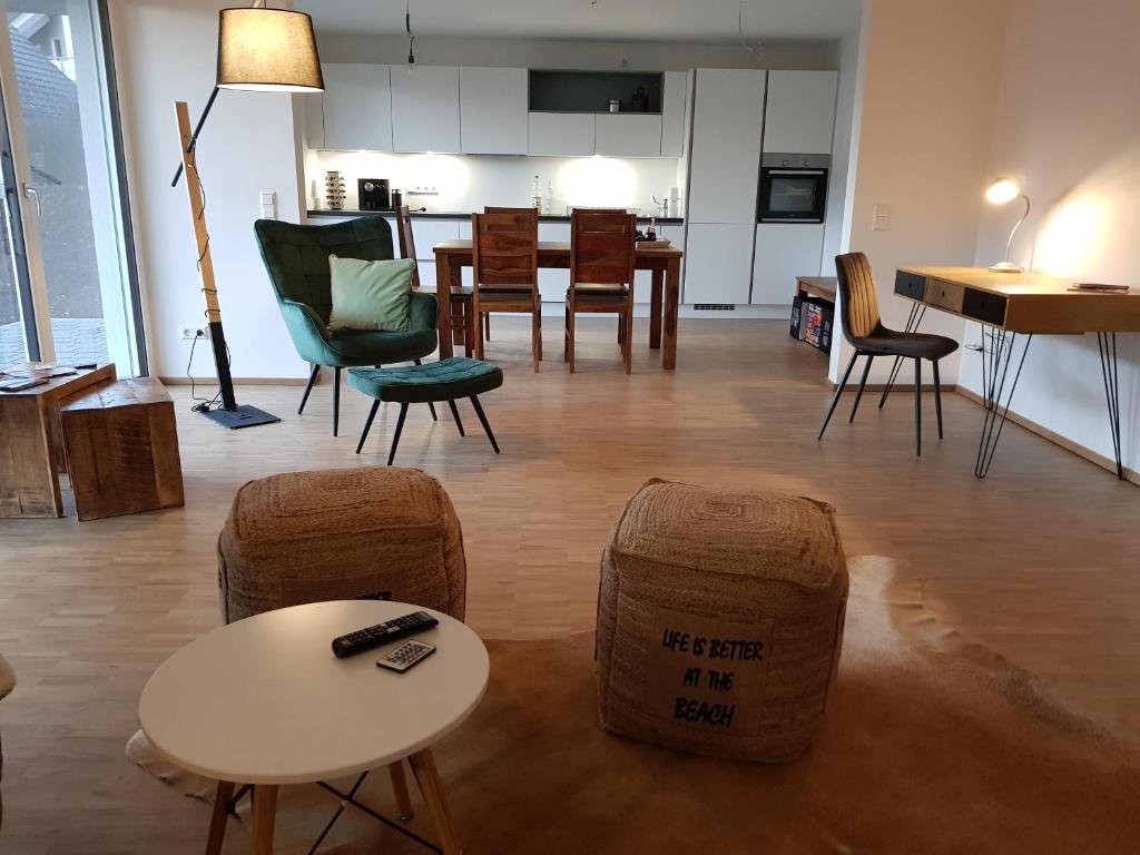Bei der Unterkunft handelt es sich um einen Neubau. Ich habe die Unterkunft selbst geplant und so eingerichtet, als ob ich selbst darin wohne. Durch die große Fensterfront ist die Wohnung mit Licht durchflutet und auf der großen Terrasse kann man die Sonne bis in den Abend genießen. Die Wohnung wurde mit 4 Sternen vom Deutschen Tourismus Verband ausgezeichnet.
