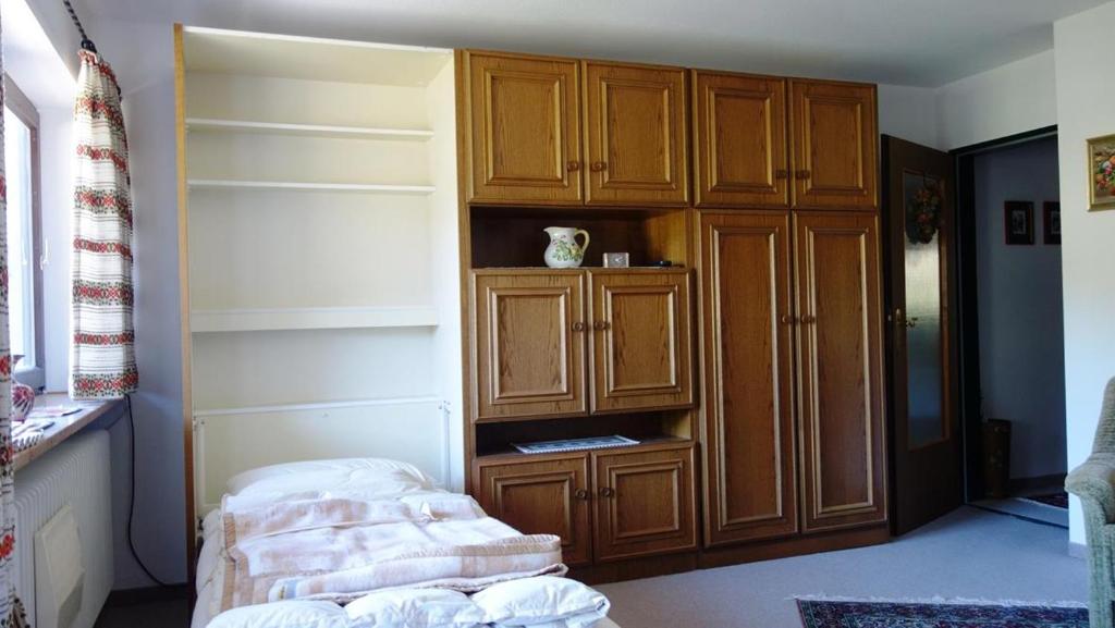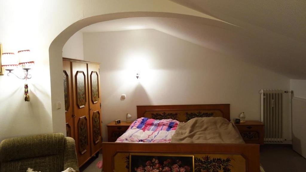 Am Waldbahnhof 7, 83242 Reit im Winkl Wohnen wie zu Großmutters Zeiten Dieses gemütliche 1 Zimmer Apartment ist eingerichtet wie zu Großmutters Zeiten. Die kleine Küche mit Essecke lässt keine Wünsche offen. 2 Platten Herd, Kühlschrank mit kleinem Gefrierfach, Kaffeemaschine, Toaster etc. Im geräumigen Wohnzimmer mit Eckbank und 2 TV Sessel, großer Schrank mit TV macht man es sich so richtig gemütlich und kann die Seele baumeln lassen. In einer Nische hat das große Doppelbett mit Nachtkästchen und Schrank seinen Platz gefunden und lädt zum Träumen ein, die Bauernmalerei auf Schrank und Bett ist stielvoll und antik. Auf dem Balkon mit seinem schönen Ausblick auf den Hausberg, kann man es sich gemütlich machen.