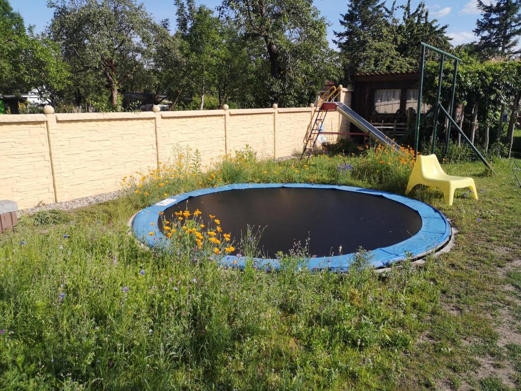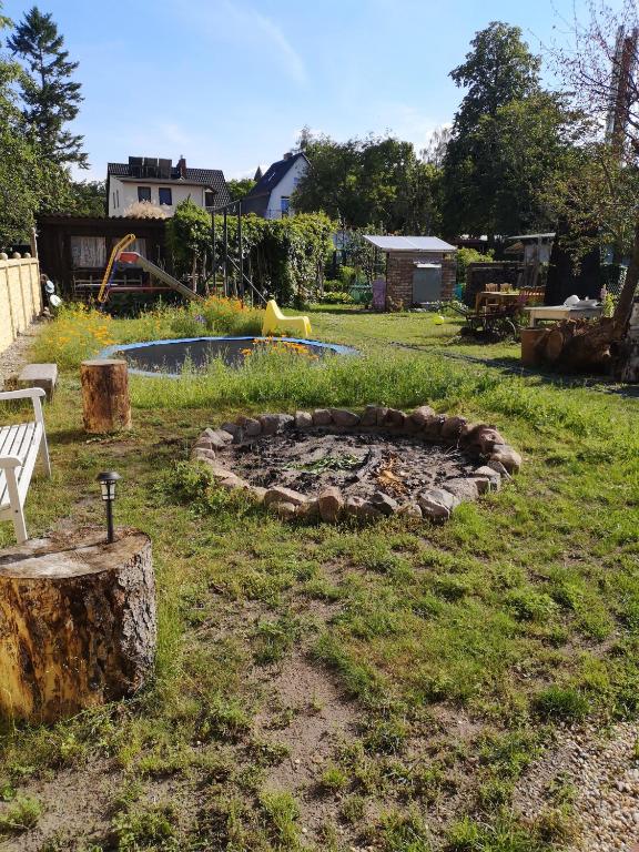Im Garten werden Sie auch ein Lagerfeuer, Gartenstühle, eine Rutsche, eine Schaukel und ein Trampolin vorfinden.