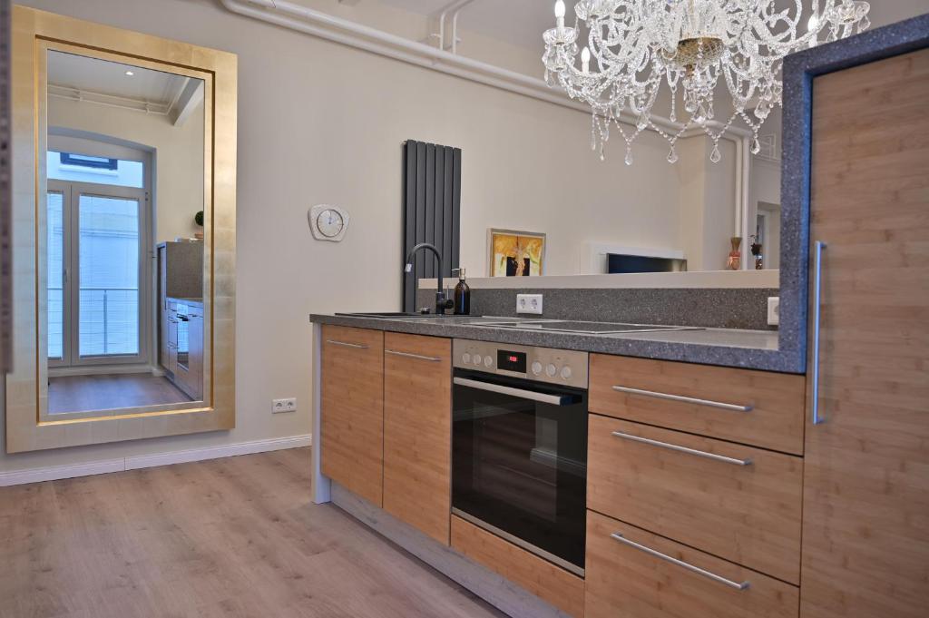 Unsere Luxus-Ferienwohung für zwei – mit moderner, offener Küche, komfortablem Bad, hohen Decken, hellen Farben, warmem Holzfußboden und viel Licht durch große Fenster. Hier genießen Sie elegantes Design und Wohlfühlambiente in ruhiger Hinterhoflage. Kunst und Objekte, Blattgoldspiegel, ein großer Kronleuchter und viele andere liebevolle Details runden den luxuriösen Charakter dieser Wohnung ab.