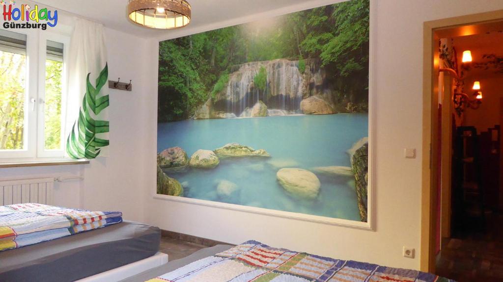 Tauchen Sie mit uns ein in das Abenteuer "Jungle". Die Ferienwohnung "Jungle Adventure" macht ihren Urlaub mit ihrer exklusiven und stilechten Ausstattung zu einem echten Erlebnis. Das Abenteuer soll nach dem Legoland noch nicht enden? Hier geht es weiter! Die Ferienwohnung "Jungle Adventure" liegt im schönen Günzburg und ist nur 4 km vom Legoland und rund 10 Gehminuten wunderschönen Altstadt Günzburg's entfernt. Dieses Apartment bietet in 2 Schlafzimmern insgesamt 2 Doppelbetten und 2 Stockbetten. Auch eine vollausgestattete Küche mit Geschirrspüler und Kühlschrank, sowie ein Flachbild-TV, ein Sitzbereich und ein Badezimmer stehen Ihnen zur freien Verfügung. WLAN, Waschmaschine, Wäschetrockner, inklusive. Restaurants, Eis-Cafe, Bank, Bäckerei, Supermarkt, Post etc. befinden sich in unmittelbarer Nähe und sind bequem zu Fuß zu erreichen. Die Wohnung bietet großzügige Platzverhältnisse für einen entspannten Aufenthalt. Ulm liegt 25 km vom Apartment entfernt. München und Stuttgart erreichen Sie in rund 60 Fahrminuten mit dem Auto.