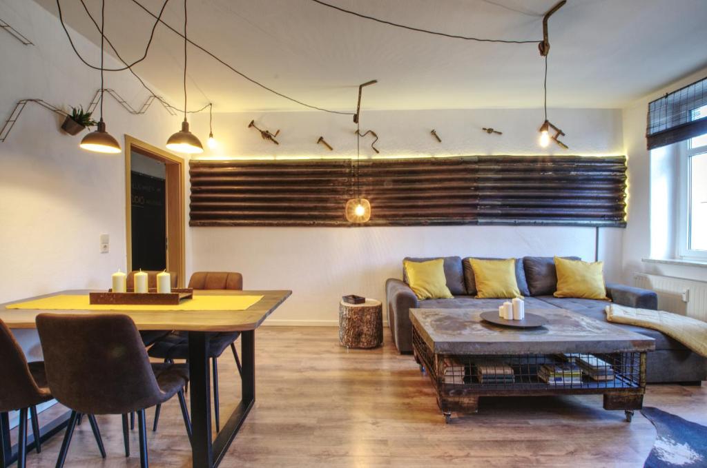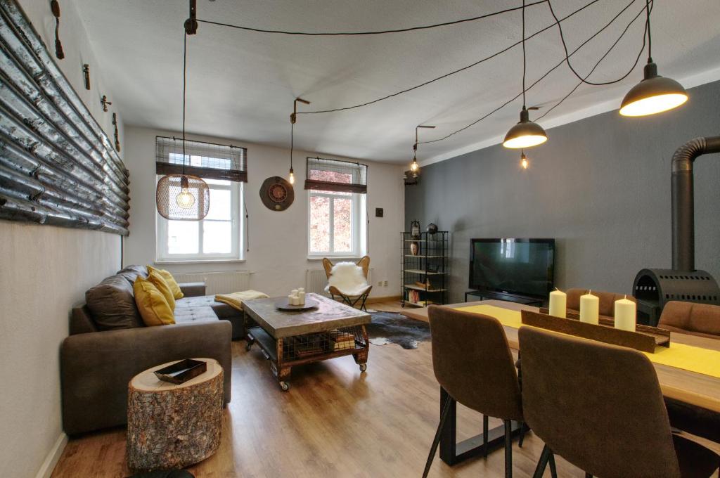 Das Loft Studio Annaberg ist ein großzügiges City-Appartement in der Innenstadt von Annaberg-Buchholz. Von hier aus ist es nur ein kleiner Fußweg in die Einkaufsstraßen oder zum Markt. Die Einrichtung ist modern im Industrie-Stil gehalten. Vom Flur gelangt man in das große Wannenbad und in die vollausgestattete Küche mit Sitzplatz für zwei Personen. Von der Küche habt ihr Zugang zur großzügigen Terrasse. Von hier hat man einen tollen Blick und kann die Abendsonne genießen. Das Schlafzimmer ist ausgestattet mit einem 180×200 großen Doppelbett mit Federkernmatratzen und Topper, sowie einem (Schmink-) Tisch und Kleiderschrank. Das geräumige Wohnzimmer hat eine Schlafcouch für weitere zwei Personen, einem Essplatz und einem Kaminofen. Hier kann man gemütlich den Urlaubstag ausklingen lassen. Die Ferienwohnung ist geeignet für eine zwei Personen oder eine Familie. Im Loft Studio Annaberg könnt ihr gerne Urlaub mit eurem Vierbeiner machen.