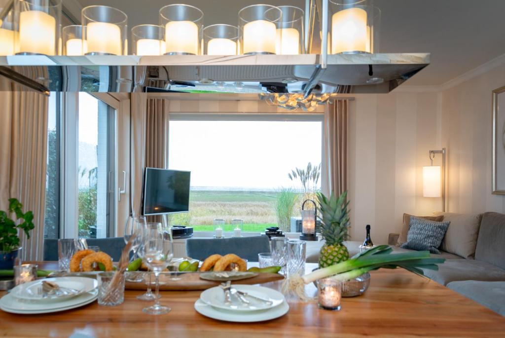 Nachteile: Im Detail zeigen sich einige Schwächen, sowohl in der Beschreibung der Wohnung als auch in der Ausstattung. Zur Beschreibung: Nur der Wohn-Essbereich und ein kleines Badezimmer mit ebenerdiger Dusche befinden sich in Parterre. Nicht erwähnt ist, dass sich die beiden Schlafräume und das zweite Badezimmer mit Badewanne im Keller befinden, ohne direktes Tageslicht, nur mit Kellerschächten. Da nutzt das ganze Licht Design nichts, wenn ich zum Duschen eine steile Treppe laufen muss - so ich das denn ob meines Alters noch kann. Zweite Unterlassung in der Beschreibung: Im Zentrum von Morsum (insgesamt 1100 Einwohner verteilt auf 9 Dörfer) befindet sich genau 1 sehr gute Bäckerei/Konditorei, 1 Supermarkt, das Gemeindehaus mit 1 kleinen Restaurant sowie der Bahnhof Morsum. Andere Restaurants oder Geschäfte sind fußläufig nicht erreichbar. Zur Ausstattung der Wohnung: Die Möbel halten bei weitem nicht, was sie optisch versprechen. Die schicken Stühle sind zu niedrig für den Esstisch, die Polsterung ist von minderer Qualität. Das Ecksofa ist nicht geeignet zum längeren Sitzen oder Lesen bei Schietwedder. In der Küche gibt es lediglich noch eine Espressotasse, die zweite ist offensichtlich abhanden gekommen. Den Schiefer- Platzsets fehlen die Füsse. Die Messer sind stumpf, Gemüseschäler fehlt, anderes Besteck alles, nur nicht hochwertig. Es wirkt, als ob die Küche mehr Dekoration denn Lebensraum ist. Fischzubereitung im Backofen ist ausdrücklich nicht gestattet. In der Küche gibt es keine Alufolie oder Topflappen, aber immerhin 2 abgezählte Müllbeutel, 1 Spüllappen und genau 1 Geschirrspül-Tab für eine Woche. Da sind wir von anderen Ferienwohnungen am Meer deutlich Besseres gewohnt, angefangen vom Fischbesteck bis zu Fleur de Sel. Letzte vermeintliche Kritik ist das WLAN. In unserer Woche funktionierte es immer mal wieder, aber selten dauerhaft. Es ist aber möglich, dass das ein generelles Problem auf Sylt ist.