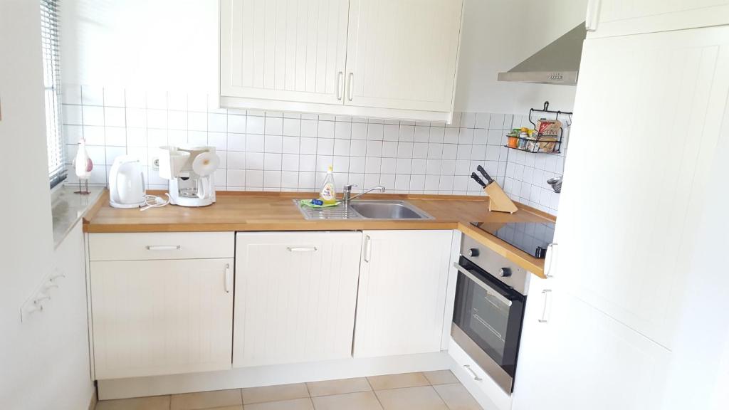 Die 2 Zimmer Ferienwohnung befindet sich im Erdgeschoss eines Ferienhauses mit insgesamt 6 Wohnungen. Die Gäste des Hauses schätzen die ruhige Lage abseits der Straße und mit Blick auf eine große Wiese. An die nach Westen ausgerichtete Terrasse schließt sich der Garten an, der ebenfalls genutzt werden kann. Den Gästen steht ein eigener PKW Stellplatz sowie ein Fahrradschuppen und eine Münzwaschmaschine zur Verfügung. Die Wohnung ist mit einer gut ausgestatteten Einbauküche inklusive Geschirrspüler, Herd und Backofen, Kaffeemaschine, Wasserkocher, Toaster. Die Ferienwohnung hat 1 Schlafzimmer mit einem 1,80 m breiten Doppelbett und geräumigem Kleiderschrank. Sie ist mit einem Duschbad mit Fön ausgestattet. Bettwäsche und Handtücher sind mitzubringen. Ein Kinderhochstuhl sowie ein Kinderreisebett sind kostenlos verfügbar.