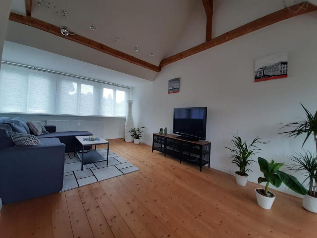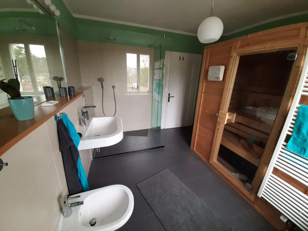 Die Ferienwohnung ist 72 m2 groß, erstreckt sich über das 1. Obergeschoss und Dachgeschoss und ist für bis zu 6 Personen buchbar. Sie ist ausgestattet mit einem Schlafzimmer mit Doppelbett (1,80 x 2,00 m), einem Schlafbereich mit französischen Bett (1,60 x 2,00 m) und einem ausziehbaren Sofa, welches für 2 Personen einen Schlafplatz bietet. Im Wohnzimmer befindet sich ein Sofa und ein Ohrensessel, der zu entspannten Fernsehabende einlädt. SAT-TV, DVD-Player, sowie eine Spielekonsole sind vorhanden. Die Küche ist ausgestattet mit einem Geschirrspüler, Backofen, Kühlschrank mit integriertem Gefrierfach, Induktionskochfeld, Toaster, Kaffeemaschine und Wasserkocher. Das Badezimmer verfügt über eine große, ebenerdige Dusche mit Regendusche, Waschbecken, WC, Bidet und einer eigenen für bis zu 4 Personen nutzbaren Sauna. Im Gästebad befindet sich ein WC und ein kleines Waschbecken. Bettwäsche, Bade- u. Handtücher und Fön sind inclusive