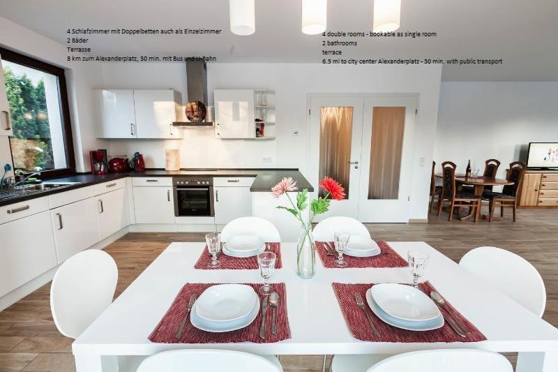 Unsere 140 qm Ferienwohnung in Berlin Pankow-Niederschönhausen bietet Ihnen ein grosszügiges Wohnzimmer, bis zu 4 Schlafzimmer und 2 Bäder. Der Grundpreis gilt für 4 Gäste. WLAN/ WiFi ist kostenlos verfügbar. Bettwäsche und Dusch-/Handtücher sind im Preis ebenfalls inbegriffen. Alle angezeigten Preise sind Endpreise inclusive Endreinigung, Übernachtungs- und Mehrwertsteuer. Die Kaution, ist bei Übergabe fällig. Der Zugang zur Wohnung und die Wohnung selbst stufenlos, sie ist jedoch nicht behindertengerecht. Der Küchen- und Wohnbereich bietet Ihnen nicht nur eine voll ausgestattete Küche mit Spülmaschine, Cerankochfeld, Herd und Kühl-/Gefrierschrank. Kaffeemaschine, Wasserkocher und Toaster sind natürlich auch vorhanden. Hier befinden sich auch zwei Essbereiche mit einmal 8 und einmal sechs Plätzen. Ein Hochstuhl für Kleinkinder ist auch vorhanden. Von der Küche gelangt man zur Terasse, diese ist ca. 25 m² groß. Ein Fernseher und ein paar Gesellschaftsspiele ermöglichen Ihnen einen ruhigen Abend, wenn Sie doch von Berlin genug haben sollten.