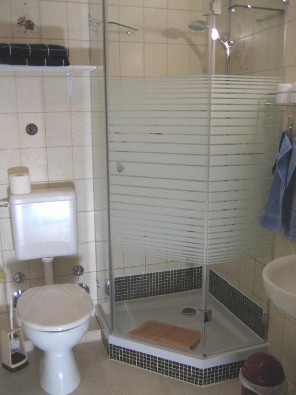 Die kinderfreundliche Unterkunft verfügt über einen Eingangsbereich mit Fliesenboden. Diese führt direkt zu einem Badezimmer mit WC, Waschbecken, Ablageflächen und einer Raumlüftungsanlage.