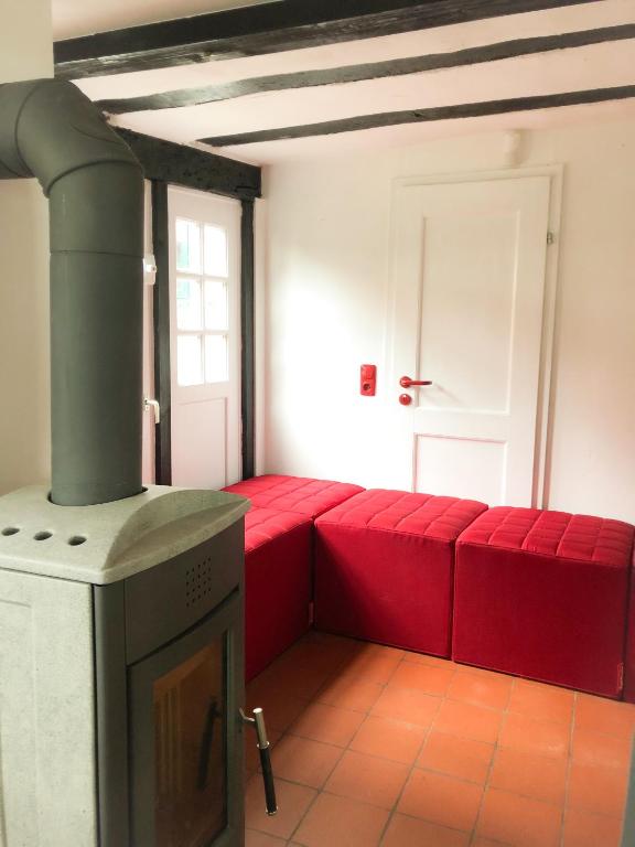 Es handelt sich um die vermutlich schrägste Art zu übernachten ! Unser Haus ist über 333 Jahre alt und es schläft sich hervorragend. Mitten in der historischen Altstadt Dreieichenhains gelegen und doch ein sehr ruhiger Standort. Optimale Anbindung nach Frankfurt, Offenbach, Darmstadt etc.: Bus und Bahn sind zu Fuß in 5 Minuten erreichbar. Dreieich-Dreieichenhain ist sehr gut angebunden an Bundestraßen, Autobahnen und Frankfurter Flughafen. Ihnen stehen Wohnzimmer, Kaminzimmer, Bad/Toilette und Schlafzimmer zur Verfügung (2 Personen - ideal für Paare und Alleinreisende). Optimale Anbindung an Frankfurt, Messe an und den Frankfurter Flughafen. Mehrere ausgewiesene Parkplätze in Fußnähe. Beim Haus direkt kann nicht geparkt werden. Das Bad ist klein und sehr gemütlich und bietet Waschbecken, Toilette und eine Dusche. Im Herzen der malerischen Altstadt von Dreieich/Dreieichenhain gelegenes liebevoll und komplett eingerichtetes Fachwerkhäuschen. Es ist ausgelegt für 2 Gäste (Schlafzimmer mit einem Doppelbett) und kann notfalls gegen Aufpreis mit zwei weiteren Personen (Kinder, nicht ideal für Erwachsene) belegt werden, die dann im Wohnzimmer auf dem Schlafsofa nächtigen können.