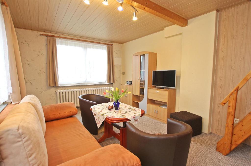Die ca. 38 qm große Nichtraucher-Wohnung wird zentral beheizt und erstreckt sich über zwei Etagen. Im Erdgeschoss befinden sich Wohnzimmer (Schlafcouch – Aufbettung für 2 Pers., Flachbild-TV, Radio, CD-Player), Miniküche (Kühlschrank, E-Platten, Mini-Backofen, Toaster), Bad (Dusche, WC, Fön) und ein Flur. Der offene Schlafraum mit zwei Liegen im Obergeschoss ist über eine Raumspartreppe erreichbar. Weiterhin stehen eine Sitzecke, Grill, Fahrrad-Unterstellmöglichkeiten und Parkplatz auf dem Grundstück (separate Zufahrt) zur Verfügung. Auf Anfrage können Fahrräder bereitgestellt werden. Im Gesamtpreis sind die Endreinigung, Wasser- und Energieverbrauch sowie Bettwäsche enthalten. Handtücher sind bitte selbst mitzubringen. Vor Ort zu zahlen: Kurtaxe. Haustiere sind nicht gestattet.