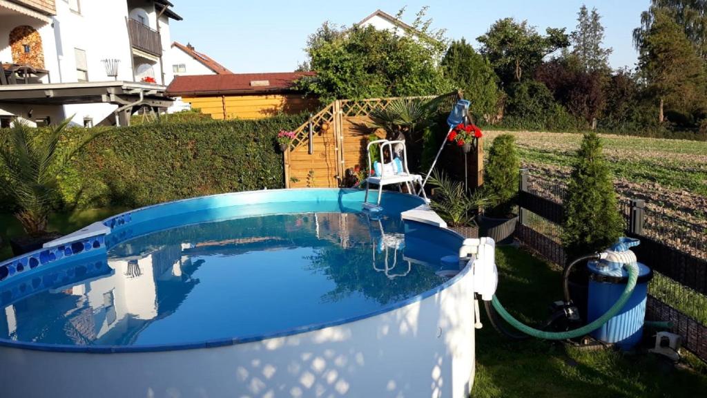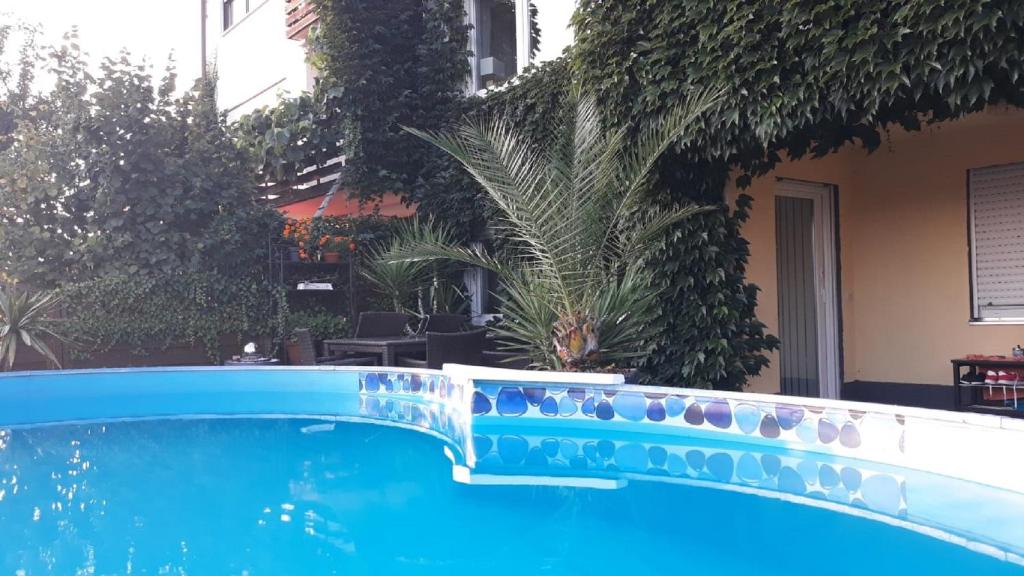Ruhige und gemütliche Ferienwohnung am Stadtrand von Passau für zwei Personen. Die 53 Quadratmeter große Wohnung besteht aus einem Wohnzimmer und einem Schlafzimmer. Im Wohnraum finden Sie Couch, Fernsehstuhl, Tisch, Fernseher und Sideboard mit ausziehbarem Tisch vor. Die Küchenzeile ist mit Herd, Backofen, Kaffeemaschine, Toaster, Wasserkocher, Spüle, Kühlschrank mit Gefrierfach, Teller, Kaffeetassen, Gläser, Besteck, Töpfe und Pfannen ausgestattet. Das Schlafzimmer hat zwei getrennte Betten mit Bettwäsche und Kleiderschränke. Im großen Bad finden Sie eine Badewanne, Waschbecken und zwei Badezimmerschränke inklusive Handtücher. Im Flur finden Sie eine Garderobe mit großem Spiegel vor. Alle Räume haben Fenster. Die Wohnung liegt zur Südseite und sehr sonnig. Das Highlight der Ferienwohnung ist der schöne Garten mit Palmen und großem Pool im Sommer.