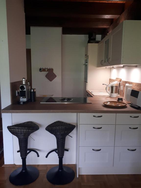 Die FeWo besticht besonders durch ihren großzügigen Südbalkon und das große Panoramafenster im Wohnzimmer mit freiem Blick auf den Hochgrat und die umliegende Berglandschaft sowie die ruhige Lage. Nur das Kuhglockengeläut durchbrecht die Stille, wenn die Tiere auf der Weide sind. Die neue Küche ist sehr gut ausgestattet mit Geschirrspüler, Bora-Kochfeld, Backofen, Nespresso-Kaffee-Maschine mit Milchaufschäumer und auch eine Filterkaffeemaschine, Kühlschrank mit Gefrierfach, Toaster, Wasserkocher, Stabmixer mit Quirl, umfangreiches Kochzubehör wie Pfannen, Töpfe, Teller, schönes Geschirr, Besteck, Gläser etc. Weiter gibt es eine kleine Kaffeebar mit 2 Barhockern. Küche, kleines Bad mit Dusche, Wohn- und Essbereich mit Kabel Flat-TV befinden sich im unteren Bereich, das Schlafzimmer ist vom Wohnzimmer aus über eine Treppe erreichbar.