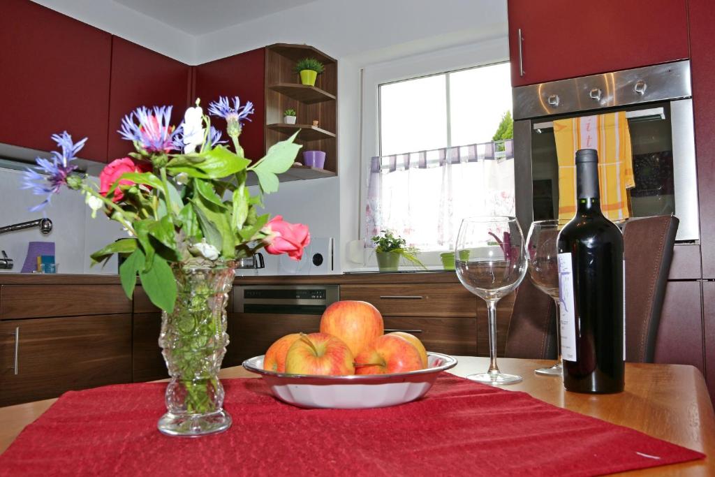 Unsere komfortable FeWo. hat ca. 60 m² Wohnfläche und bietet Platz für 3 Personen. Die Wohnung verfügt über ein Schlafzimmer mit Boxspringbett und Schwebetürenschrank mit Spiegel. Das gemütliche Wohnzimmer mit Schlafcouch und Flachbild TV, sowie einem Pelletofen, lädt sie zum verweilen ein. Die komplett ausgestattete Küche mit Geschirrspüler, Kühlschrank mit TK Fach, Elektroherd und Backofen, Microwelle, Wasserkocher, Eicherkocher, Toaster, Kaffeemaschine lässt keine Wünsche offen. Das moderne Badezimmer mit ebenerdiger Dusche, Badewanne und Handtuchtrockner,sowie Spiegelschrank rundet das Gesdamtbild ab. Außerdem steht eine Waschmaschuine zur Verfügung. Bereits zum Frühstück können sie die Sonnenstrahlen auf unserer Terrasse genießen.
